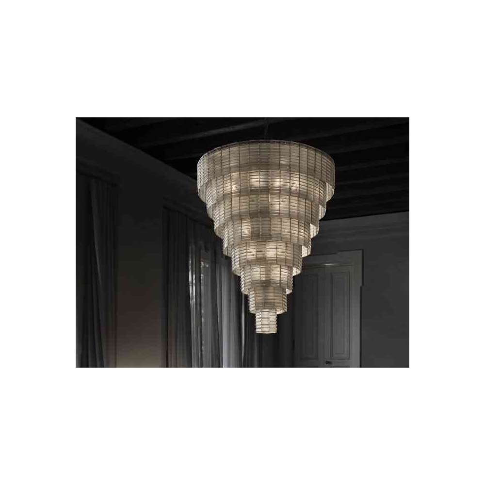 Plissè to lampa wisząca wykonana z wiszących listew z plisowanego szkła wyprodukowanego w Veneto.