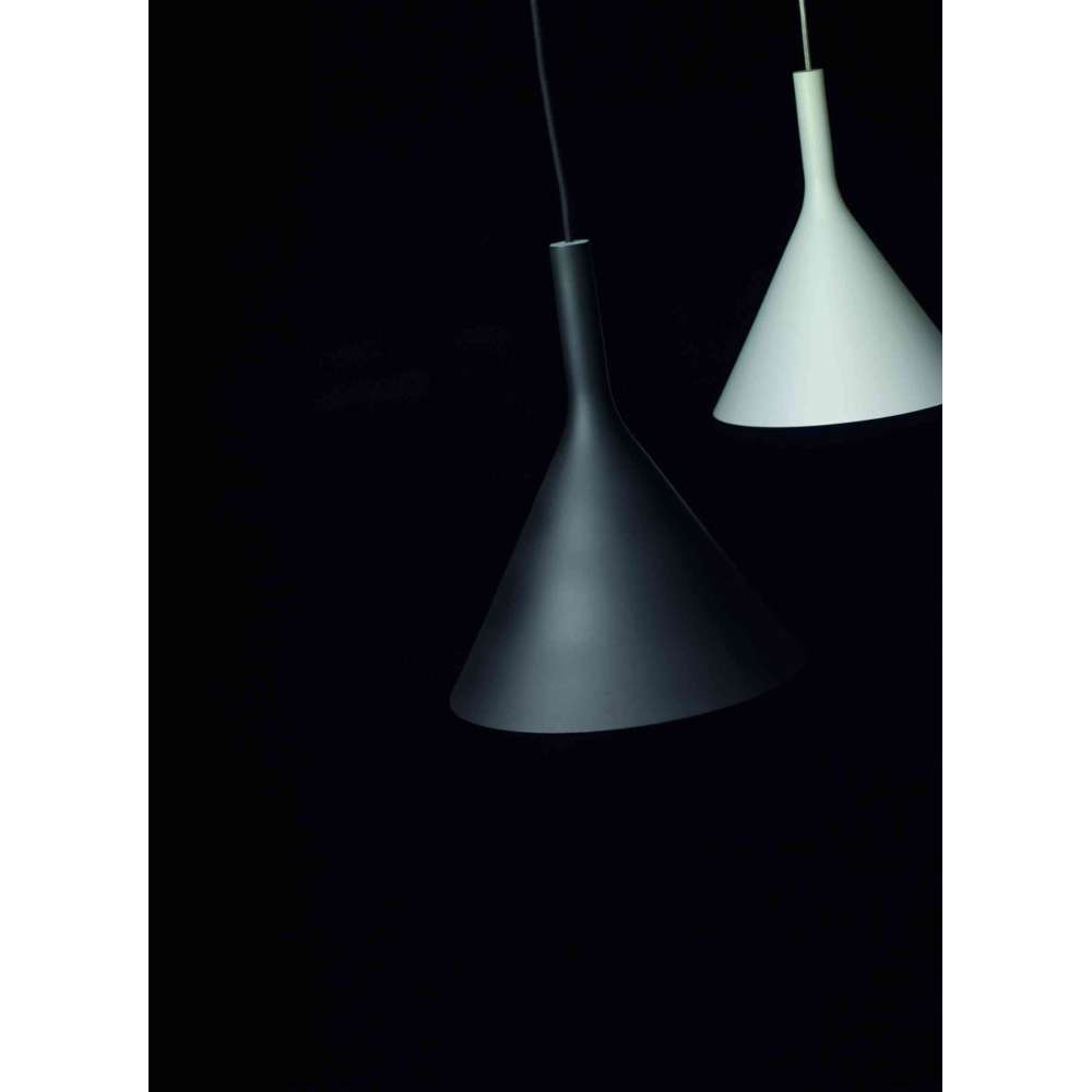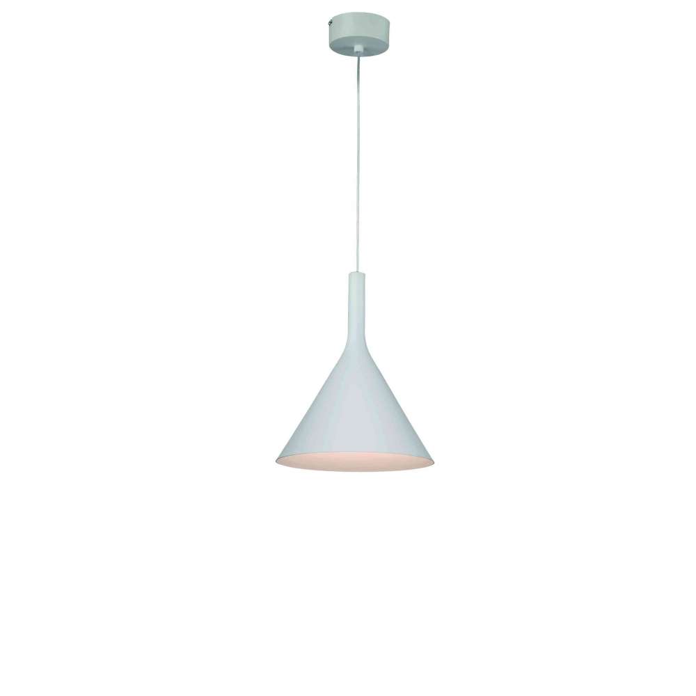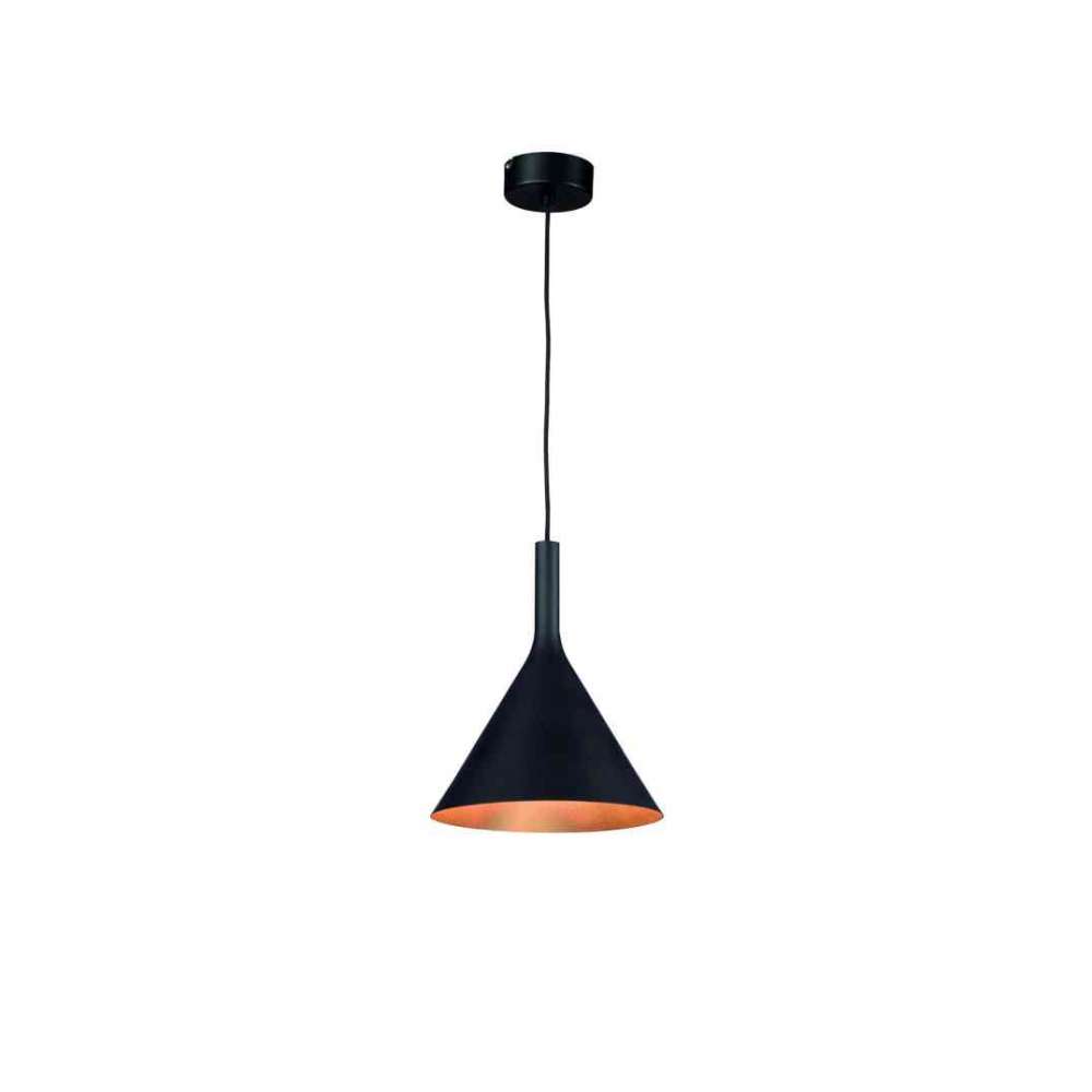 Elegancka lampa wisząca o stożkowym kształcie z metalu malowanego proszkowo, dostępna w solidnych białych i czarnych wykończeniach ze złotym wnętrzem. Zawieszony kabel przewodowy. Lampa z oprawką E27 pasująca do źródła światła halogenowego, LED lub energooszczędnego.
