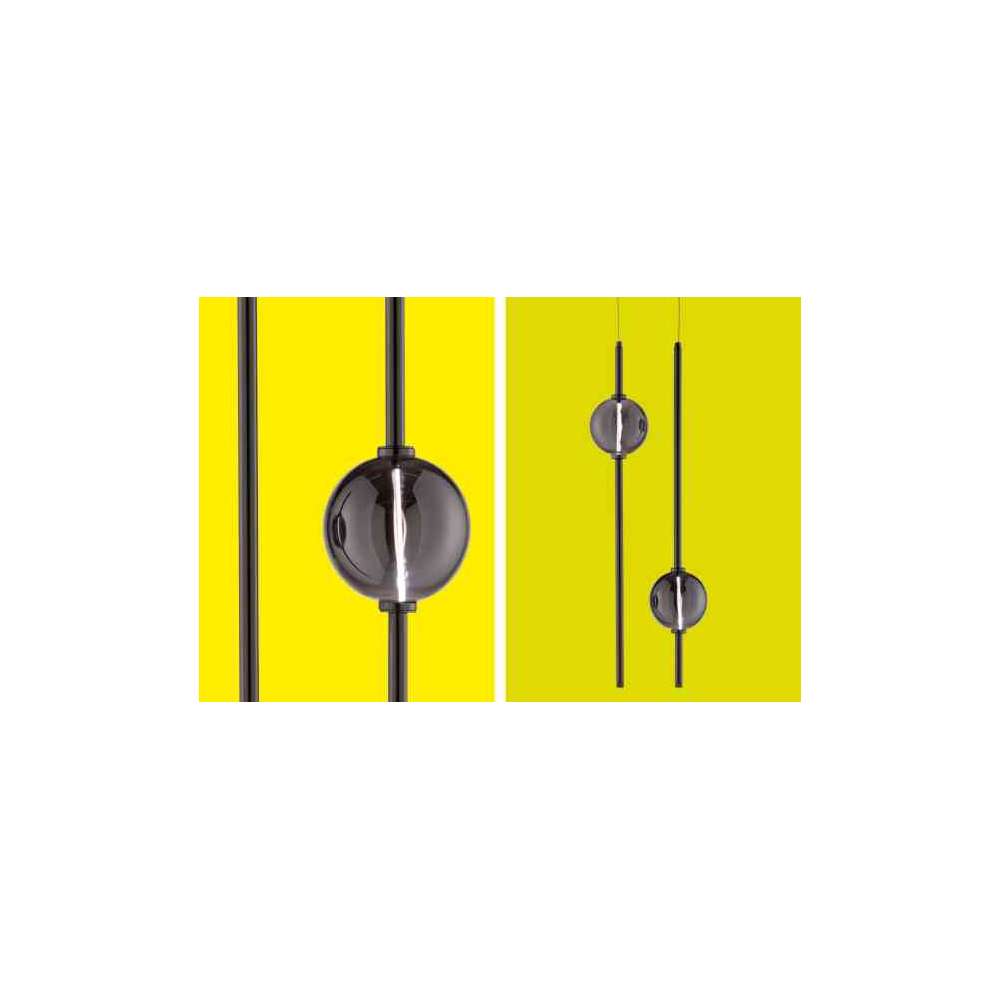 Szczegóły | kule ze szkła pyreksowego z metalową dekoracją: gdy zawieszenie jest wyłączone, źródło światła nie jest widoczne; gdy zawieszenie jest włączone, widać żarnik led.