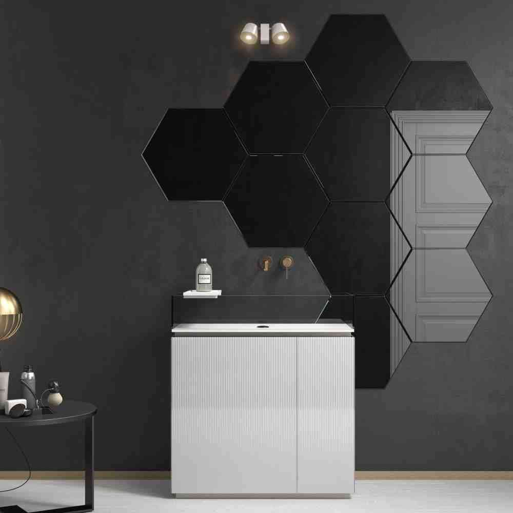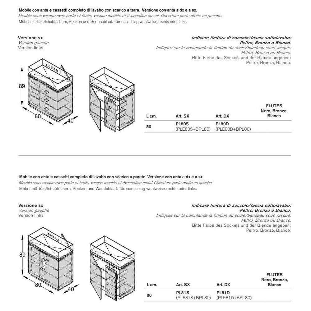 Plissé to szafka pod umywalkę z żłobkami w kolorze czarnym, brązowym i białym lakierowanym szkłem.