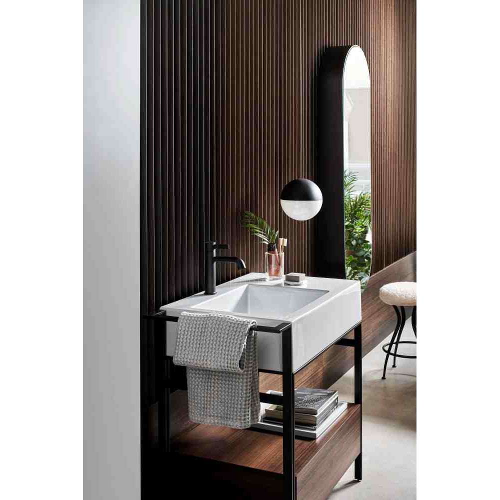 Niewielkie wymiary tej umywalki sprawiają, że nadaje się ona do małych pomieszczeń bez konieczności rezygnacji z praktyczności, którą gwarantują szuflady, schowek i wieszak na ręczniki. Sprytna gra przestrzeni „pełne-pusto” w połączeniu z wykorzystaniem różnych, ale całkowicie zintegrowanych materiałów – ceramiki na umywalkę, drewna na szuflady i malowanej stali na konstrukcję – nadaje Narcisco Mini klasę i elegancję.