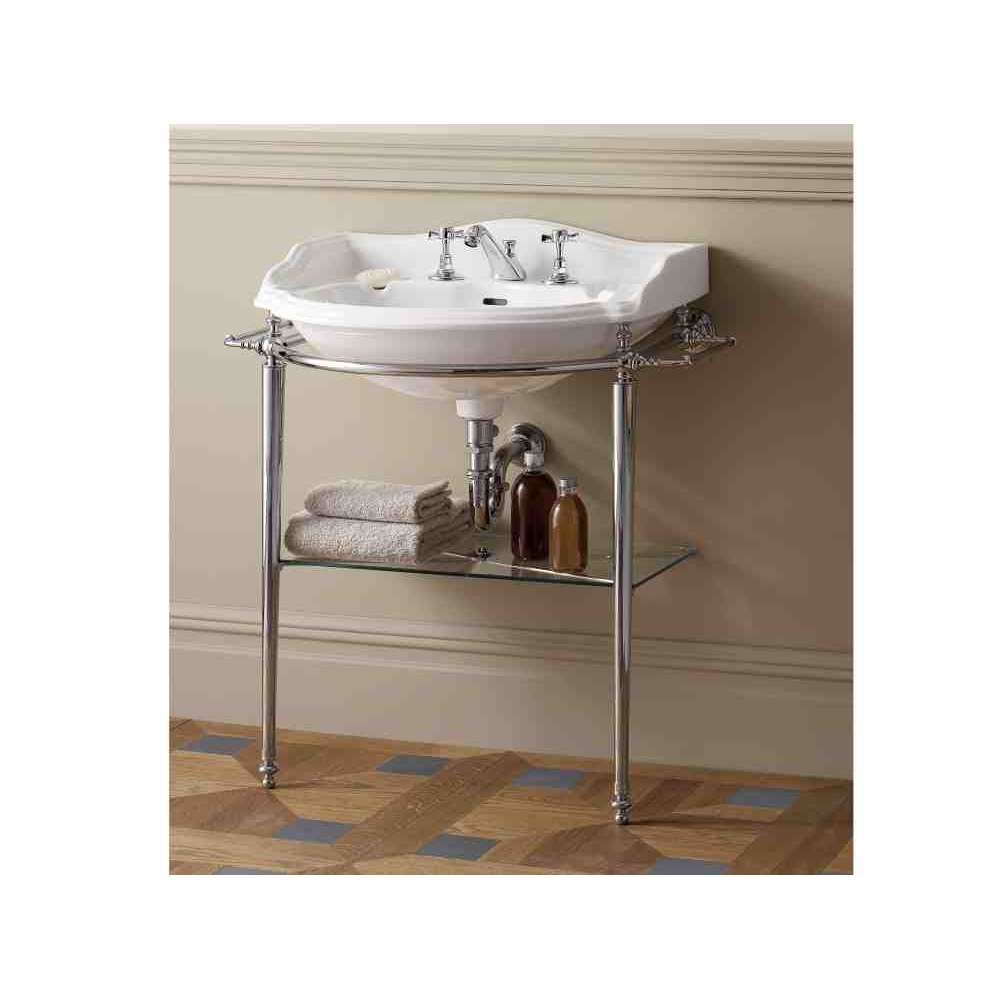 Inspirowana klasyką konsola z delikatną białą ceramiczną umywalką Oxford i wygodną szklaną półką.
