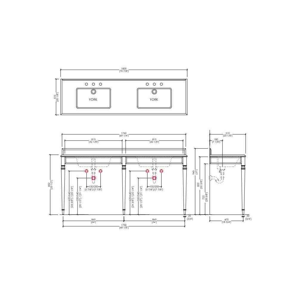 Konsola do podwójnego zlewu o liniowym designie, której ścięte nogi w kształcie piramidy, inspirowane Art Deco, czynią ten element ekskluzywnym. Marmurowy blat z welonami, dostępny w kolorze białym Carrara, białym Sivec, marmurze Black Marquinha lub całkowicie czarnym granicie, zawiera dwie duże umywalki ceramiczne. Jego nogi są z aluminium, a ramy z mosiądzu, z chromowanymi, jasnozłotymi lub polerowanymi niklami wykończeniami.