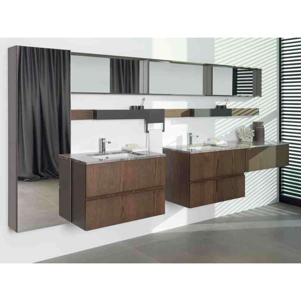 Próżność łazienkowa, która bawi się wymiarami, zapewniając dynamikę dzięki rozmieszczeniu różnych jej modułów, które pozwalają nam na nieskończoną liczbę konfiguracji.