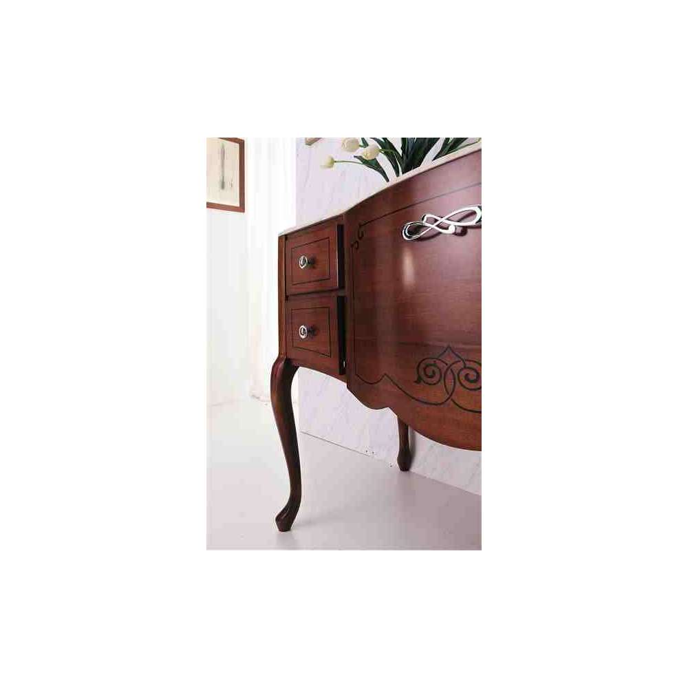 Ten wyjątkowy mebel, charakteryzujący się wijącymi się i harmonijnymi liniami, dostępny jest tylko w tej wersji z pięcioma szufladami. Wysokiej jakości rzemieślnicze wykończenia takie jak intarsja oraz specjalne rzeźbienie nóg sprawiają, że jest to wyjątkowy i niezwykle pożądany element, który dokładnie nawiązuje do wystroju z początku XX wieku. Technicznie jest wyposażony w nowoczesne prowadnice ze wspomaganiem zamykania i może być dostępny w szerokiej gamie wykończeń: połysk, mat, antyczny, antyczny orzech lub złoto srebro płatkowe.