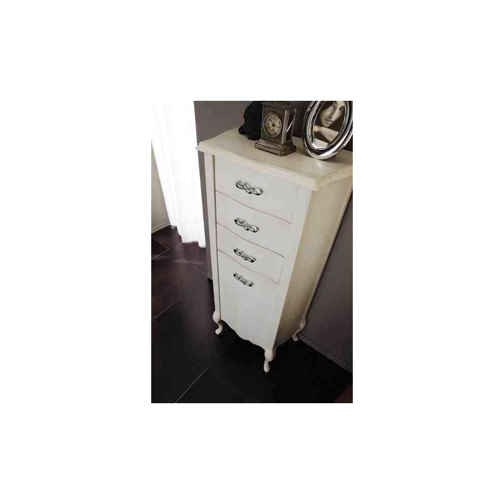 Ten wyjątkowy mebel, charakteryzujący się wijącymi się i harmonijnymi liniami, dostępny jest tylko w tej wersji z pięcioma szufladami. Wysokiej jakości rzemieślnicze wykończenia takie jak intarsja oraz specjalne rzeźbienie nóg sprawiają, że jest to wyjątkowy i niezwykle pożądany element, który dokładnie nawiązuje do wystroju z początku XX wieku. Technicznie jest wyposażony w nowoczesne prowadnice ze wspomaganiem zamykania i może być dostępny w szerokiej gamie wykończeń: połysk, mat, antyczny, antyczny orzech lub złoto srebro płatkowe.