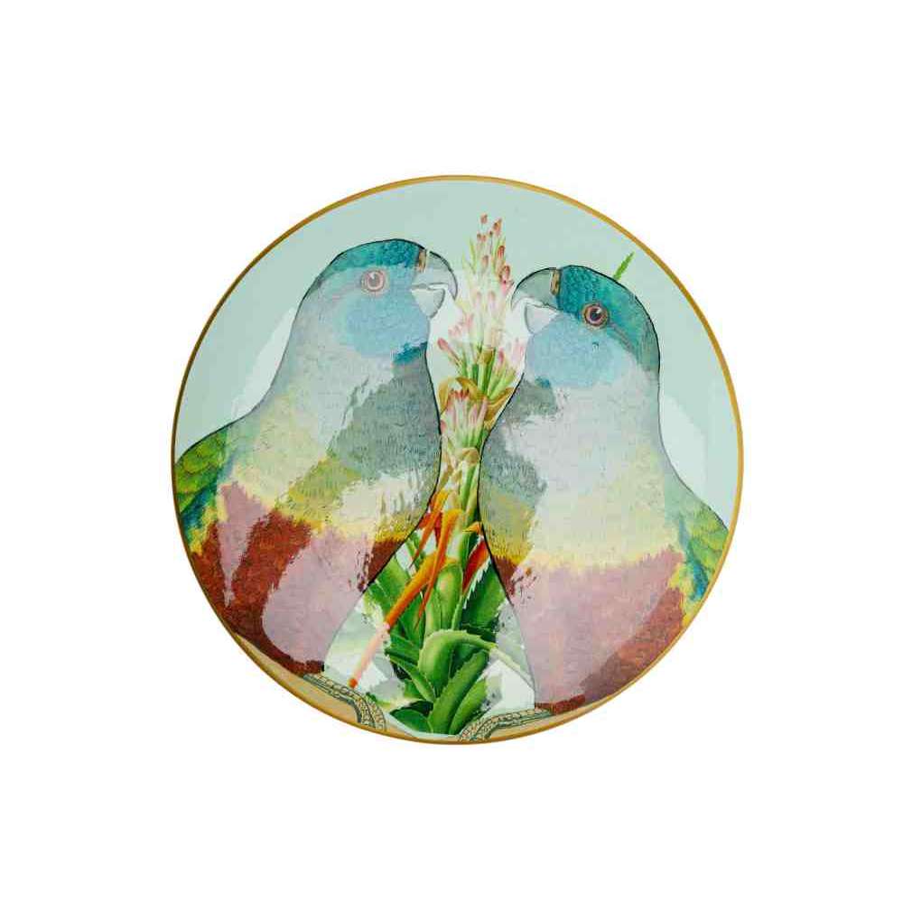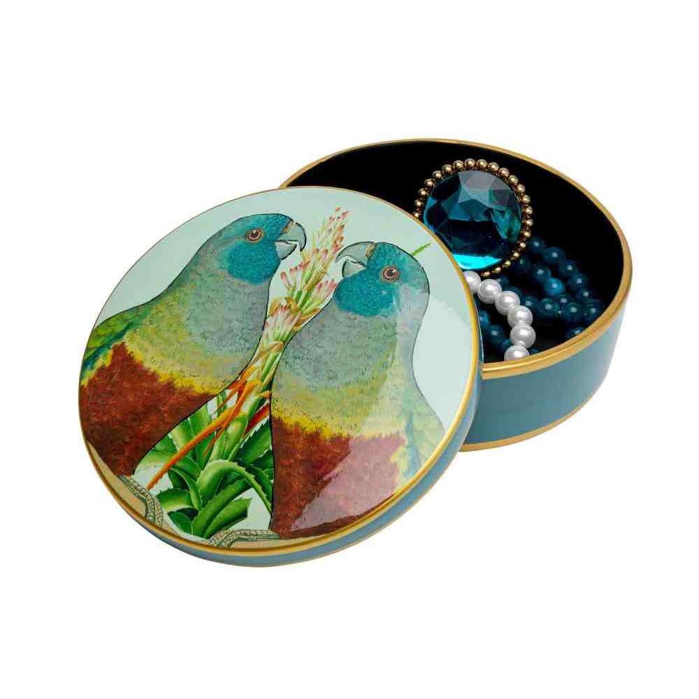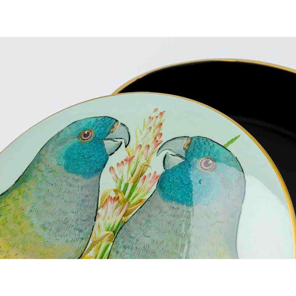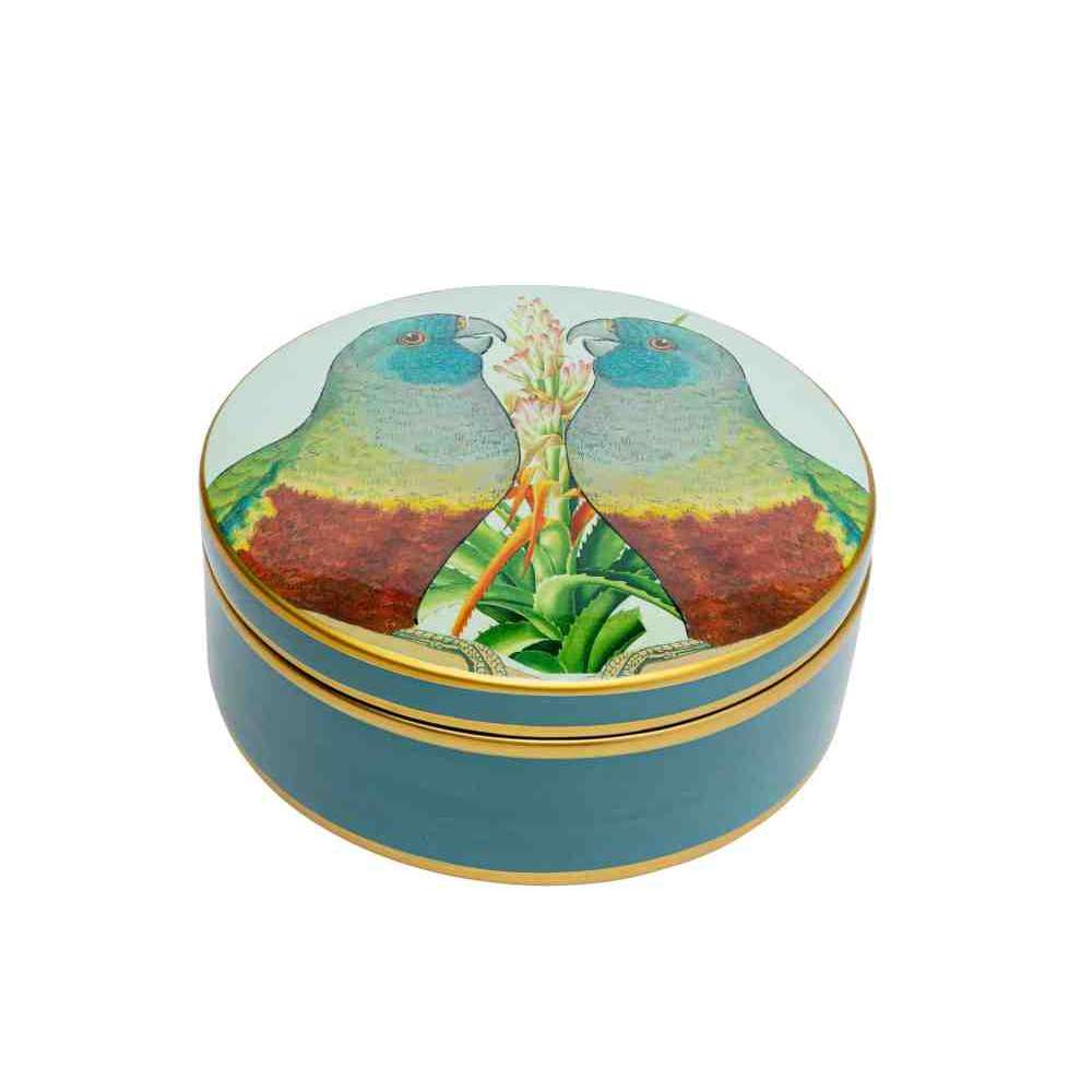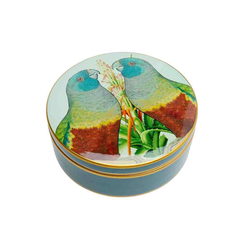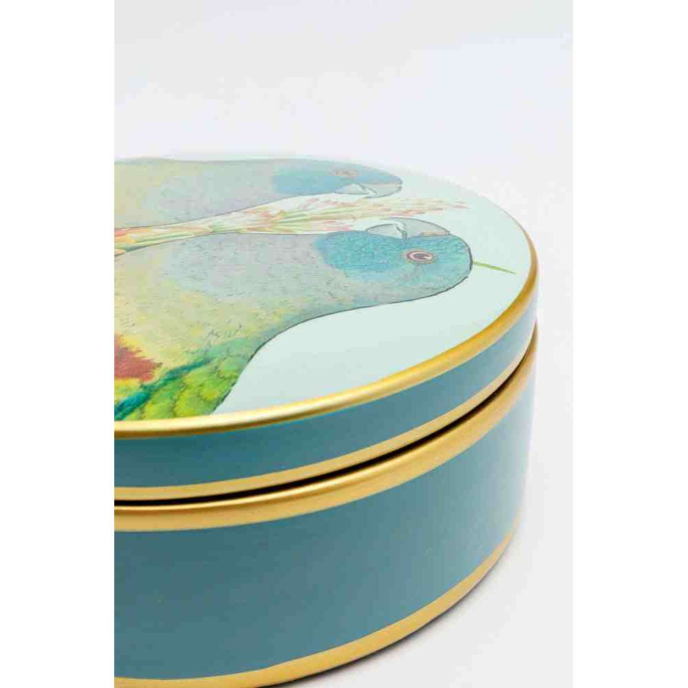 PARROT COUPLE autorstwa KARE Design to okrągła malowana porcelanowa ozdobna skrzynka. Pokrywka z motywem papugi.