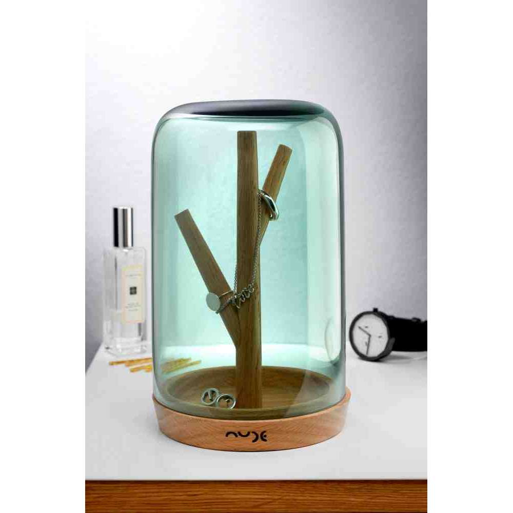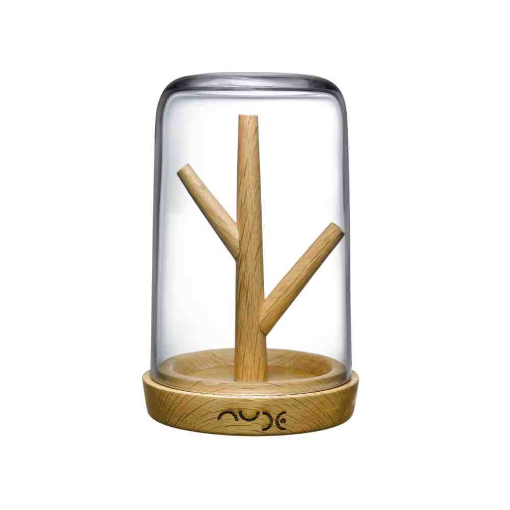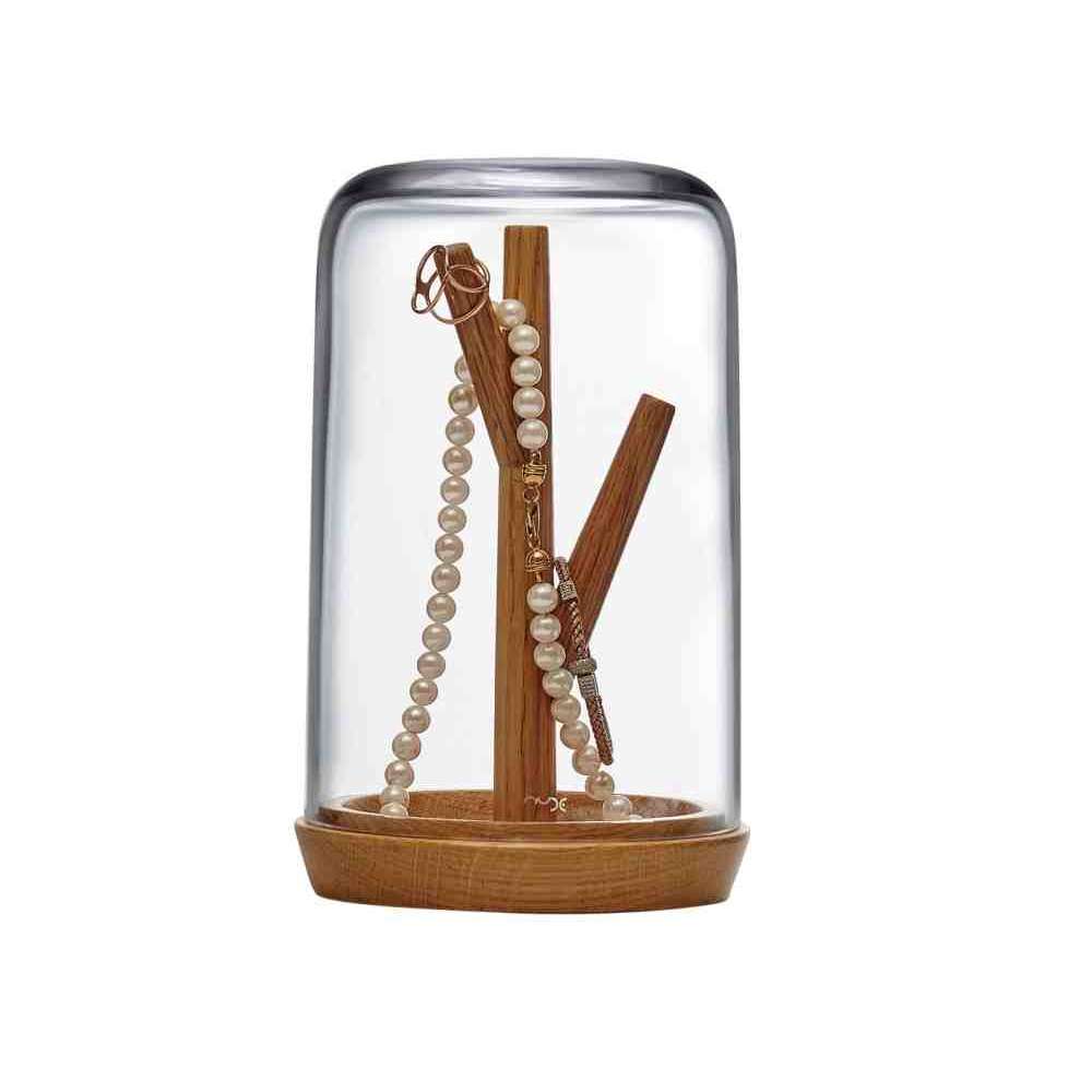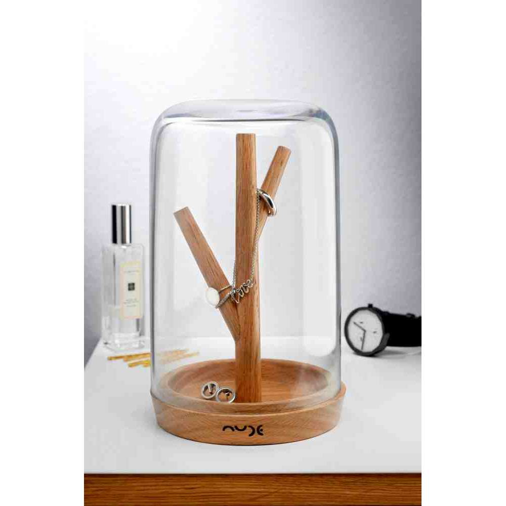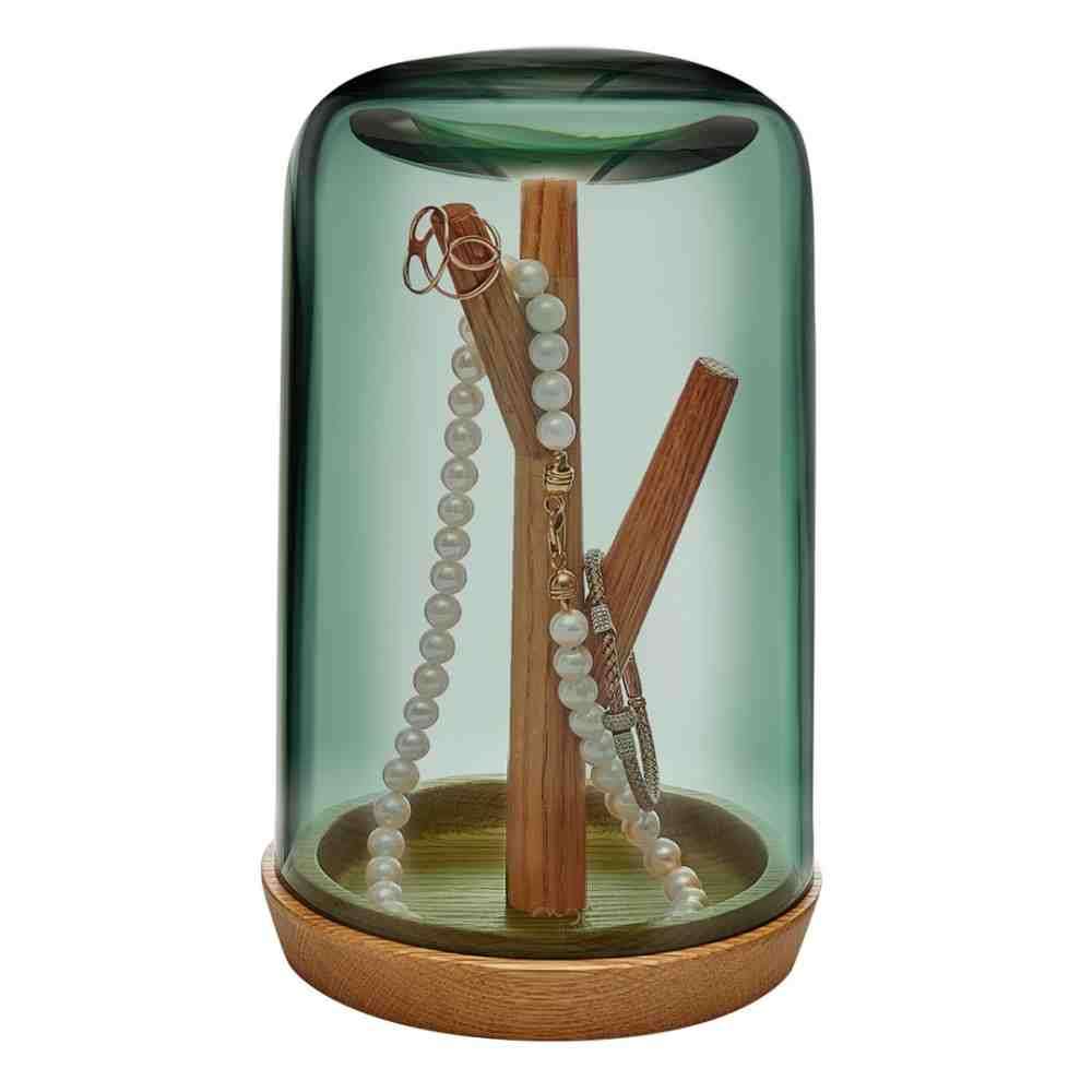 Proste drzewko jubilerskie wykonane z dębu, osadzone w czystym szkle w kolorze przezroczystym lub zielonym. Projekt sprytnie podkreśla biżuterię, kontrast między tym, co organiczne, a ręcznie wykonanym, zarówno uroczym, jak i praktycznym.