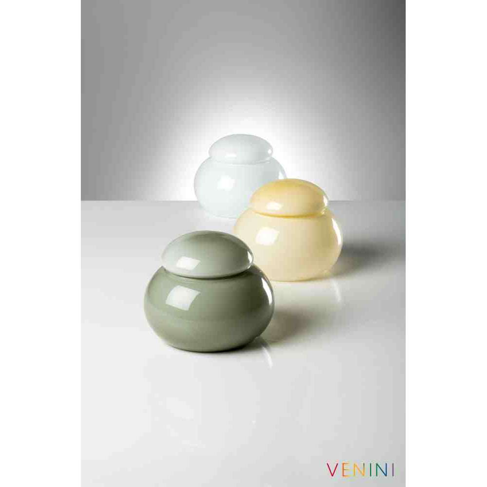 Potiche uzyskuje się przez nałożenie na lattimo innych szkieł, szkło opalowe jest dmuchane i obrabiane ręcznie. Wykonany ze szkła opalino z miękko zaokrąglonymi krawędziami, ten wyjątkowy przedmiot został stworzony przez doświadczone ręce dmuchaczy szkła. Potiche składa się z podstawy i wieczka. Idealny do bezpiecznego przechowywania bezcennych przedmiotów.