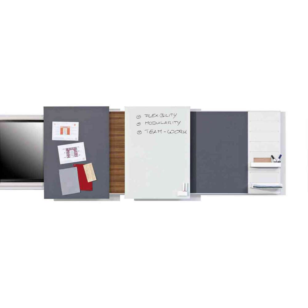 H. System to naścienny system szynowy ze statycznymi i ruchomymi tablicami białymi i kartonowymi. Umożliwia łatwe wyświetlanie i zmianę układu informacji oraz jednoczesne wyświetlanie informacji.