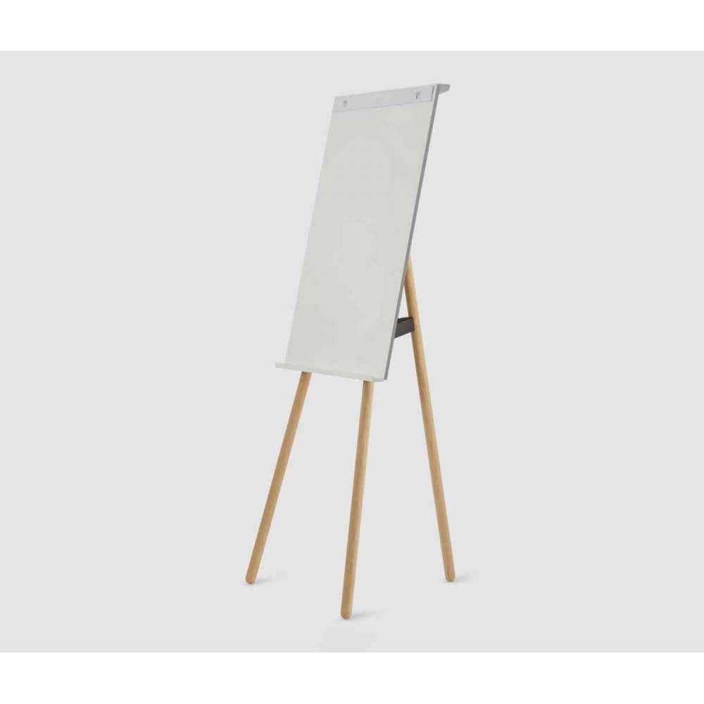 Składany może służyć jako flipchart i jest kompatybilny z każdym standardowym klockiem o rozstawie otworów co 50 cm. Podkładkę można łatwo przymocować do dwóch kołków mocujących i zabezpieczyć za pomocą listwy do zrywania. Biała tablica może być również używana jako tablica do bezpośredniego pisania. Wszystkie napisy na tablicy można następnie wytrzeć do sucha za pomocą ściereczki z mikrofibry. Tablica jest wykonana z malowanego proszkowo, magnetycznego metalu i oprócz koloru białego dostępna jest również w kolorze czarnym i czerwonym lub dowolnym odcieniu RAL na zamówienie. Jego nogi są w kolorze płyty z aluminium malowanego na biało lub czarno oraz drewna dębowego lub jesionowego.
