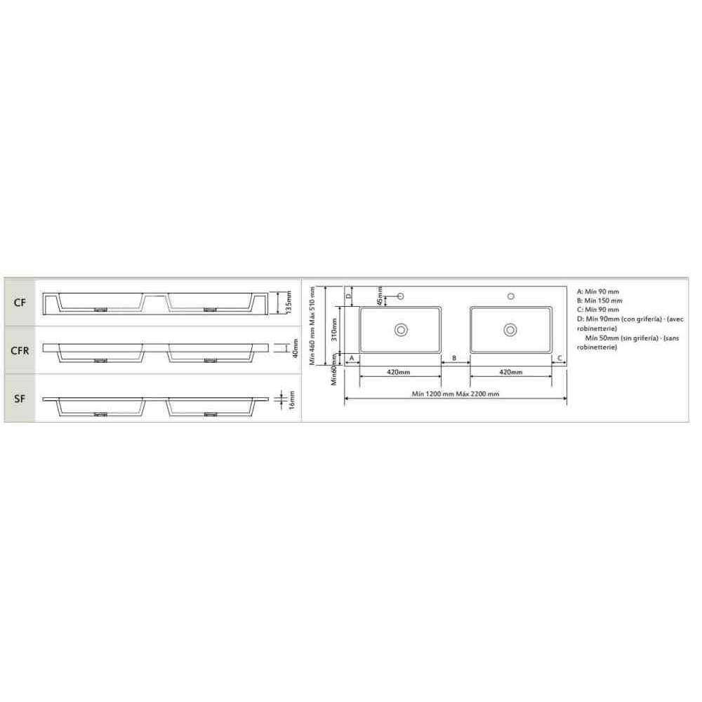 W ramach opcji podwójnej umywalki w Infinity można również wybrać dowolne położenie umywalek, znajdując 3 opcje rozmiaru umywalki (długość 420, 520 lub 620 mm). Maksymalna długość tej szafki podumywalkowej to 2200 mm. Dostępna w trzech opcjach: bez paneli (SF) do montażu na meblu, z panelami 135 mm (CF) oraz w grubości 40 mm (CFR) do montażu jako podwieszana szafka podumywalkowa.