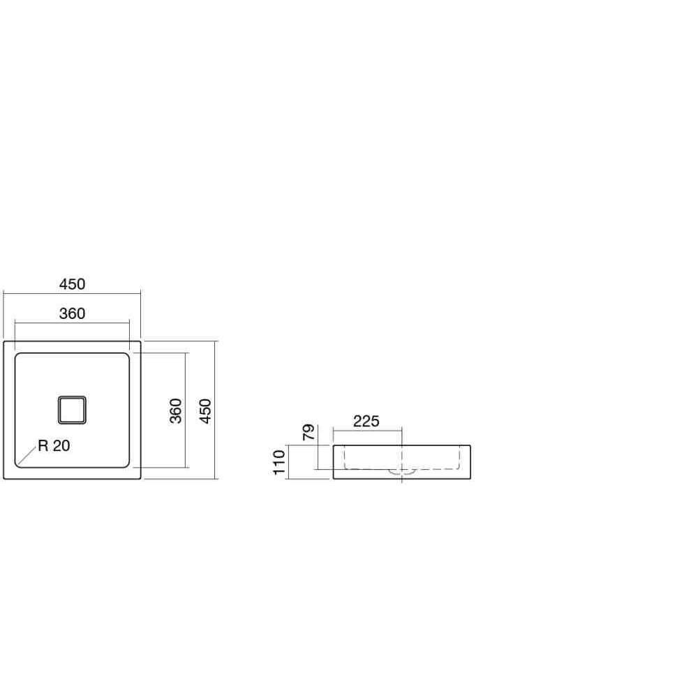Umywalka kwadratowa 450 x 450 mm, wys. 110 mm, przeszklona, bez otworu na baterię i przelewu, z zestawem montażowym i zaworem odpływowym z białą przeszkloną nasadką