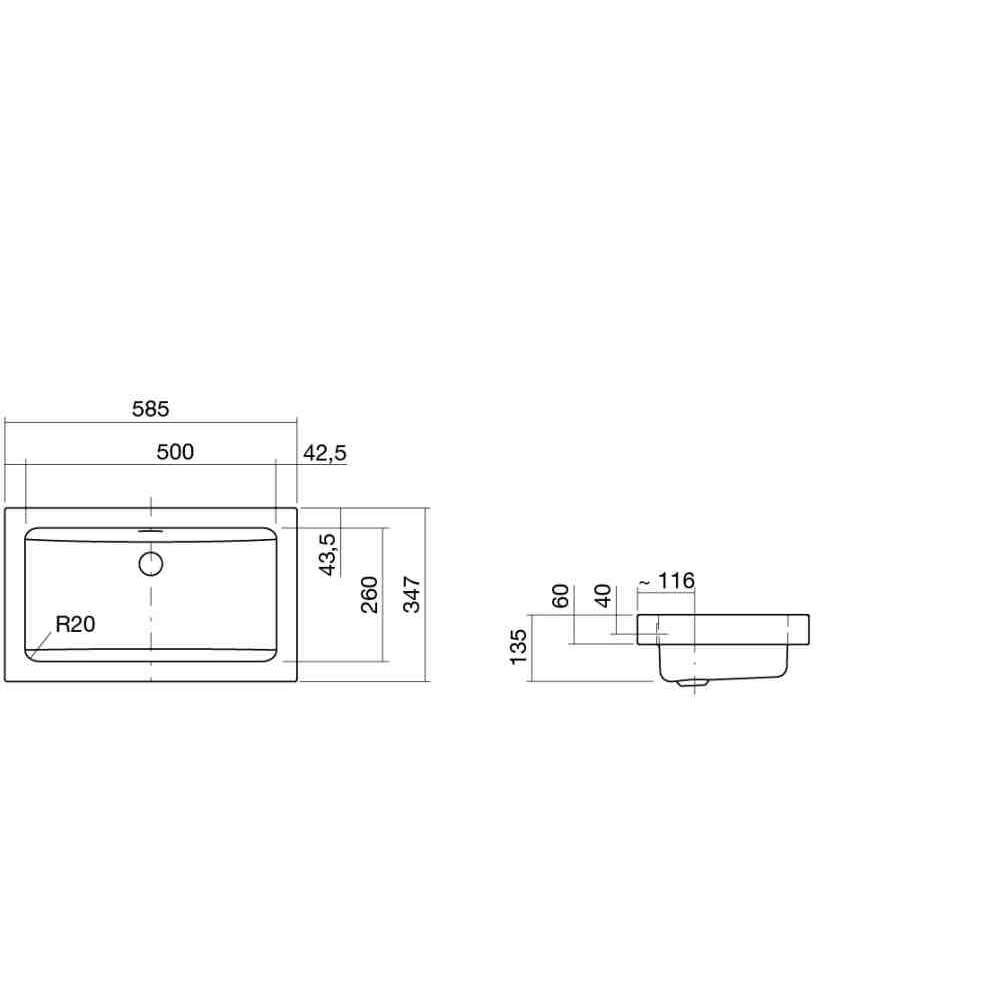 Umywalka stojąca prostokątna, 585 x 347mm, wysokość 60mm, przeszklona, bez otworu na baterię, z przelewem, w komplecie zestaw mocujący i zestaw przelewowy