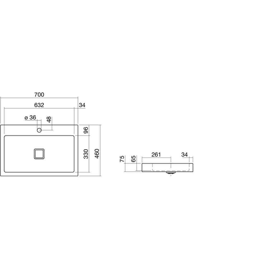 Umywalka prostokątna 700 x 460mm, wysokość 75mm, głębokość formy 65mm, przeszklona, z otworem na baterię, bez przelewu, w komplecie zestaw mocujący i zawór spustowy z białą przeszkloną nasadką