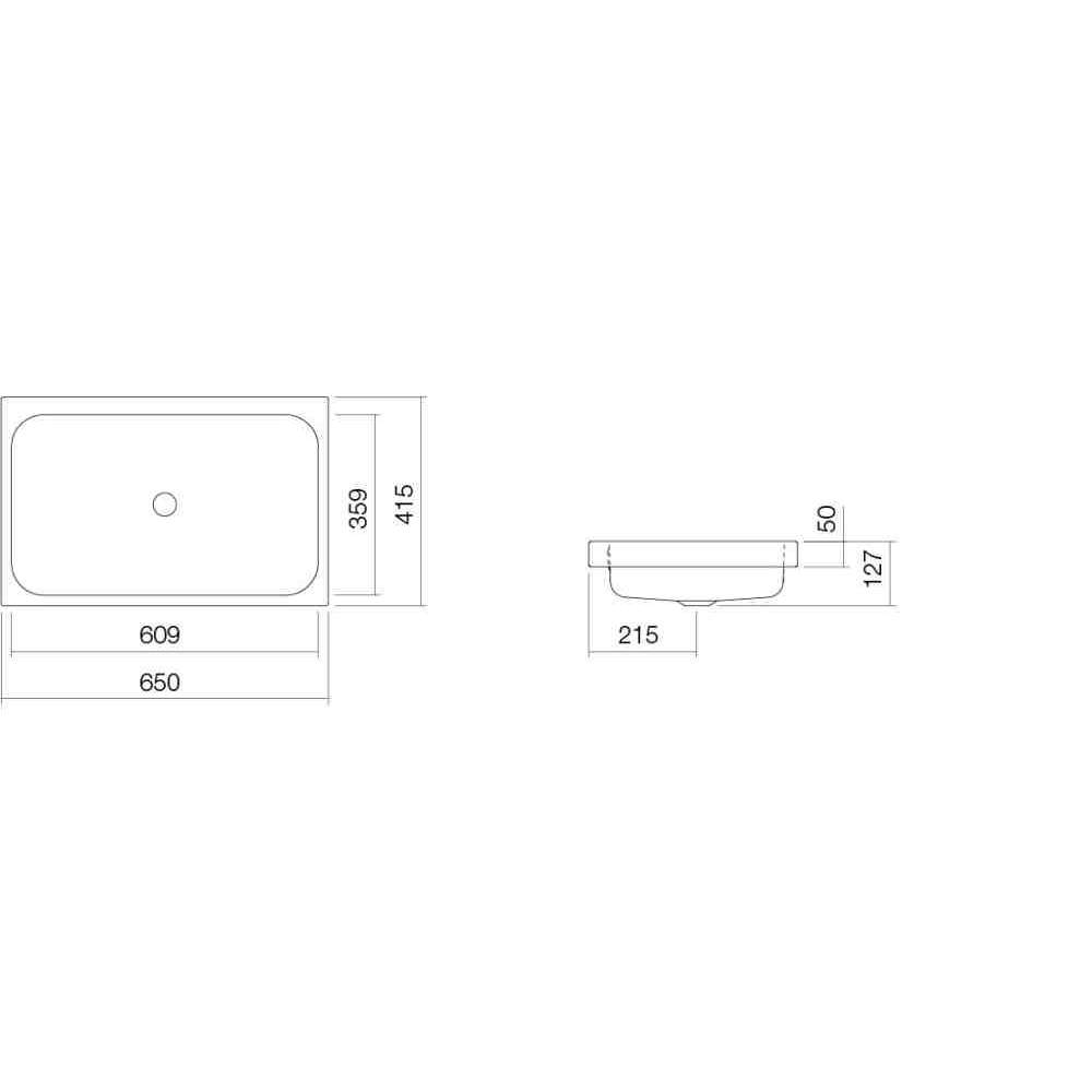 Umywalka stojąca prostokątna 650 x 415mm, wysokość 50mm, przeszklona, bez otworu na baterię, z przelewem, w komplecie zestaw mocujący i zestaw przelewowy