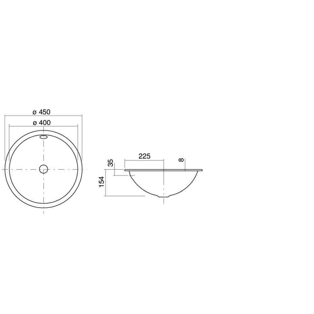 Umywalka do zabudowy, okrągła, ø 450mm, przeszklona wewnątrz i na zewnątrz, bez otworu na baterię, z przelewem, w komplecie zestaw mocujący i zestaw przelewowy