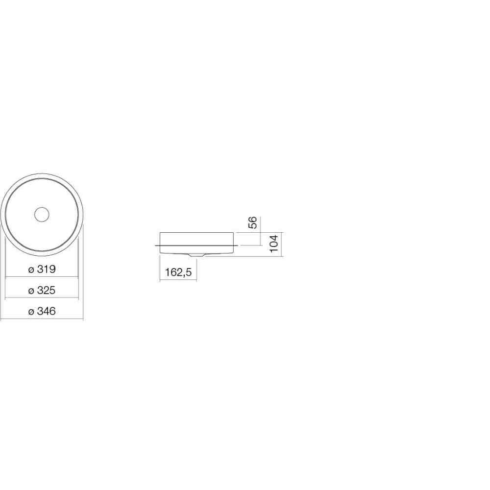 Umywalka do zabudowy, okrągła, ø 325mm, wysokość 104mm, z czego 25mm wystaje ponad blat, przeszklona wewnątrz i na zewnątrz, zoptymalizowana do montażu w blacie 30mm, bez otworu na baterię i przelewu, z zaworem spustowym z chromowaną zaślepką