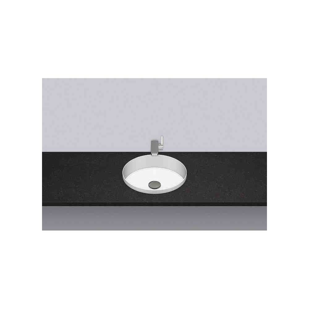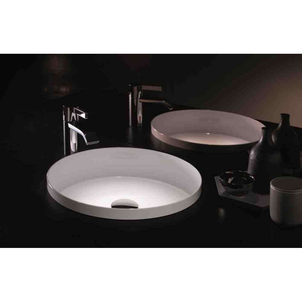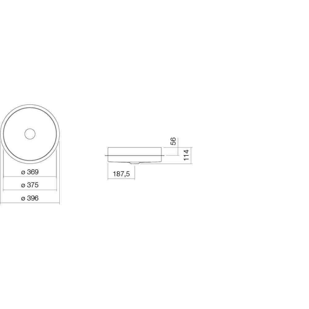 Umywalka do zabudowy, okrągła, ø 375mm, wysokość 114mm, z czego 25mm wystaje ponad blat, przeszklona wewnątrz i na zewnątrz, zoptymalizowana do montażu w blacie 30mm, bez otworu na baterię i przelewu, zawiera zawór spustowy z chromowaną zaślepką