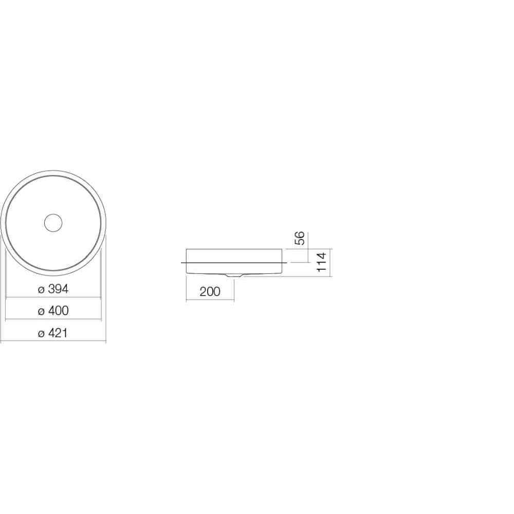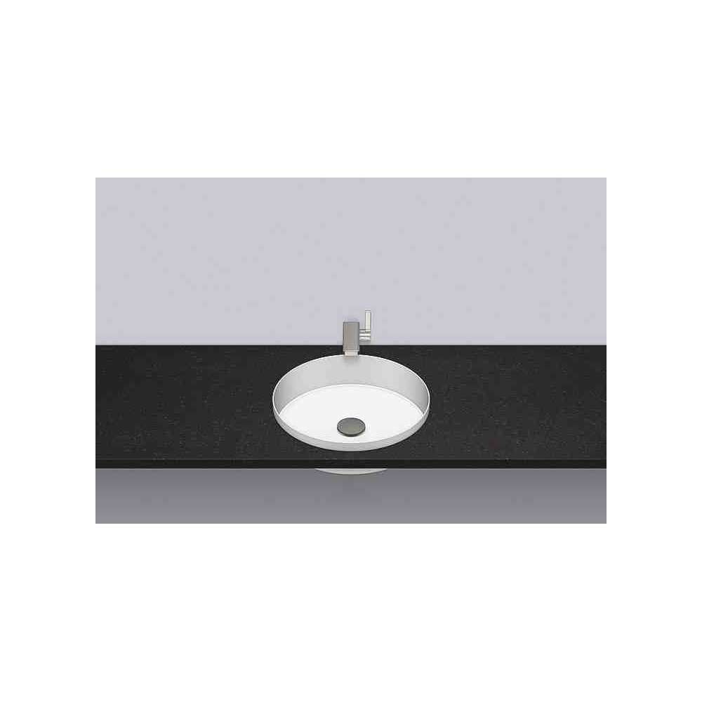 Umywalka do zabudowy, okrągła, ø 400mm, wysokość 114mm, z czego 25mm wystaje ponad blat, przeszklona wewnątrz i na zewnątrz, zoptymalizowana do montażu w blacie 30mm, bez otworu na baterię i przelewu, zawiera zawór spustowy z chromowaną zaślepką