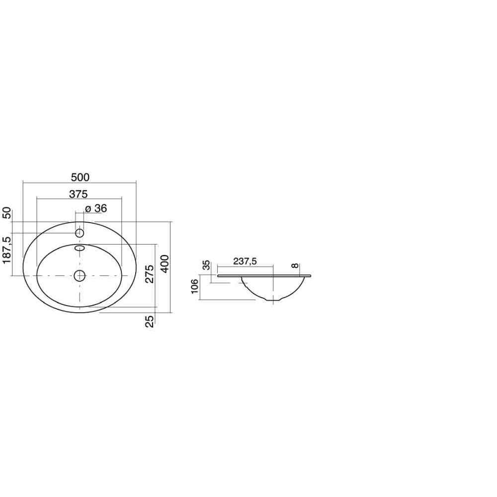 Umywalka do zabudowy, owalna, 500 x 400mm, przeszklona wewnątrz i na zewnątrz, z otworem na baterię i przelewem, w komplecie zestaw mocujący i zestaw przelewowy