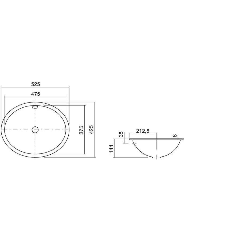 Umywalka do zabudowy, owalna, 525 x 425mm, przeszklona wewnątrz i na zewnątrz, bez otworu na baterię, z przelewem, w komplecie zestaw mocujący i zestaw przelewowy