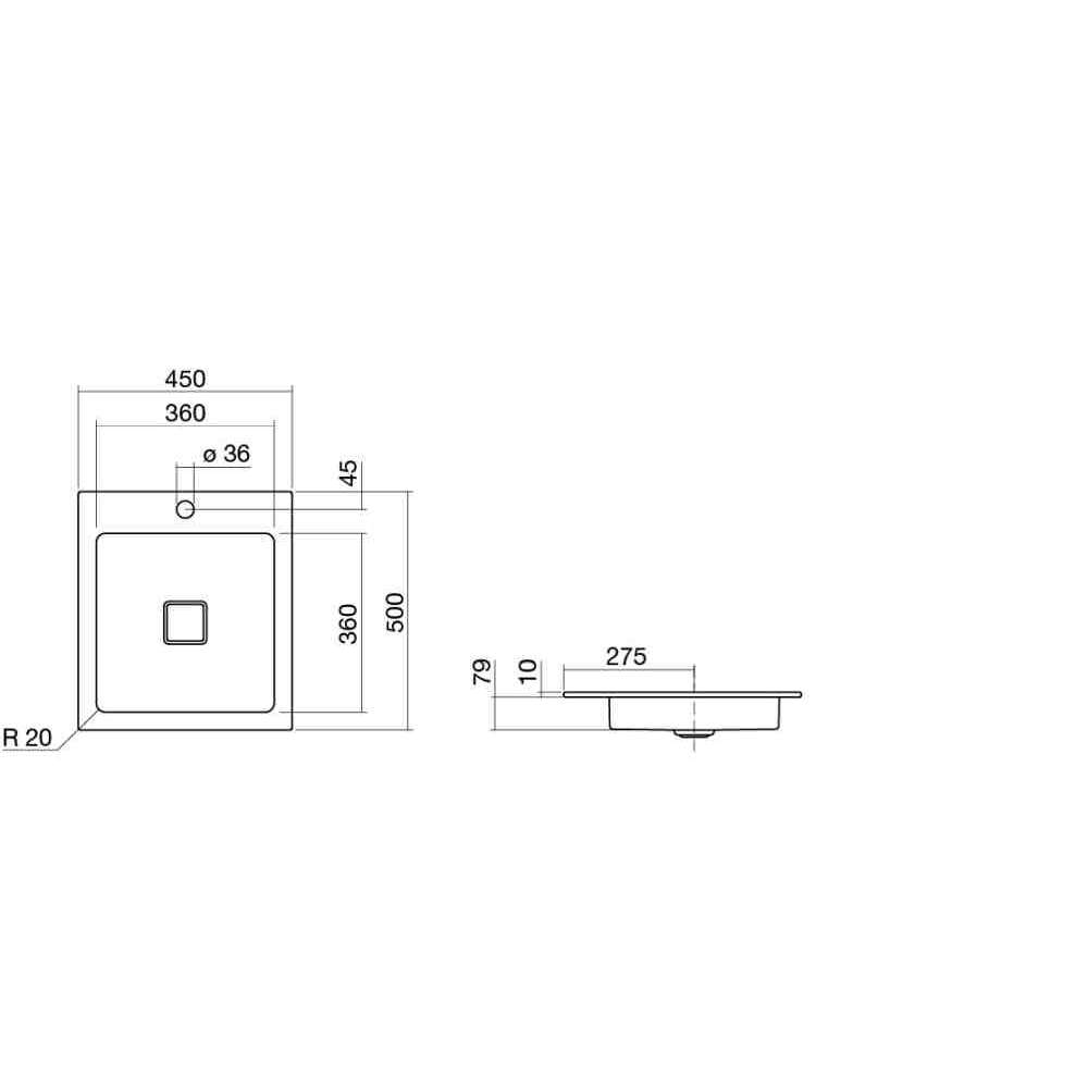 Umywalka podblatowa prostokątna 450 x 500mm, wewnątrz i na zewnątrz przeszklona, z otworem na baterię, bez przelewu, z zestawem montażowym i zaworem spustowym z białą przeszkloną pokrywą