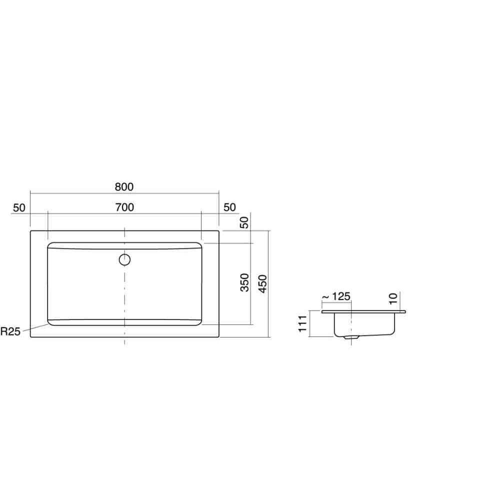 Umywalka podblatowa prostokątna 800 x 450mm, wewnątrz i na zewnątrz przeszklona, bez otworu na baterię, z przelewem, w komplecie zestaw mocujący i zestaw przelewowy