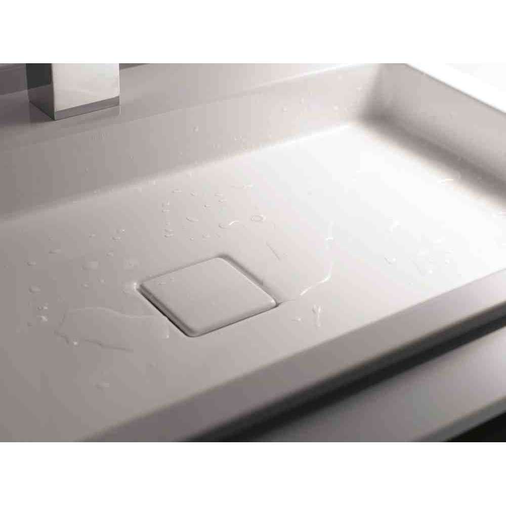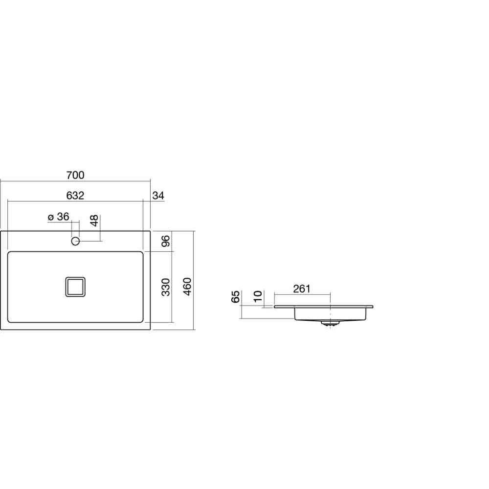 Umywalka do zabudowy prostokątna 700 x 460mm, głębokość formy 65mm, przeszklona wewnątrz i na zewnątrz, z otworem na baterię, bez przelewu, z zestawem montażowym i zaworem spustowym z białą przeszkloną pokrywą