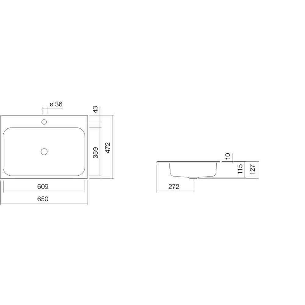 Umywalka podblatowa prostokątna 650 x 472 mm, głębokość 115 mm, przeszklona wewnątrz i na zewnątrz, z otworem na baterię i przelewem, w komplecie zestaw montażowy i zestaw przelewowy