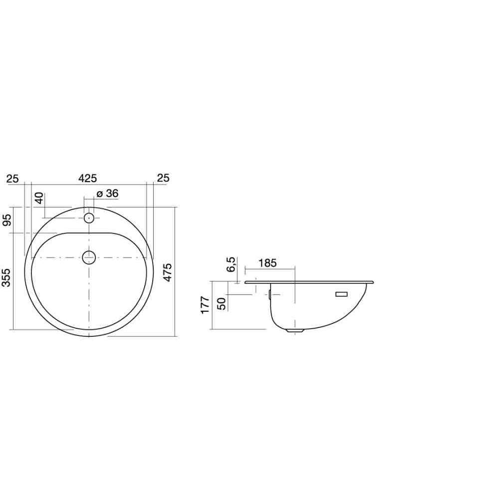Umywalka do zabudowy, okrągła, ø 475mm, przeszklona wewnątrz i na zewnątrz, z otworem na baterię i przelewem, w komplecie zestaw mocujący i zestaw przelewowy