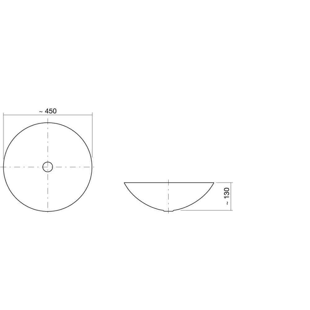 Umywalka, okrągła, ø 450mm, przeszklona wewnątrz i na zewnątrz, wysokość 130mm, bez otworu na baterię i przelewu, w komplecie pierścień podstawy i chromowany zawór spustowy