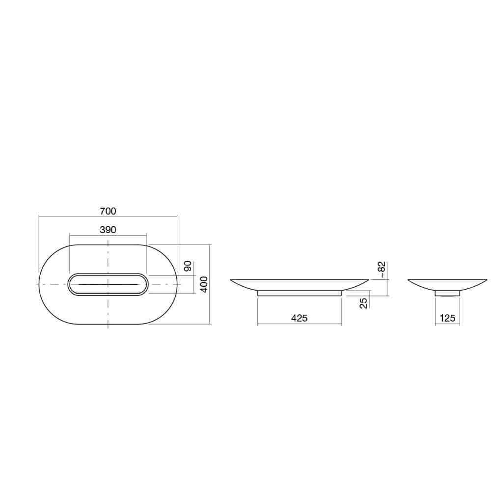 Umywalka, owalna, 700 x 400mm, przeszklona wewnątrz i na zewnątrz, płaska, wys. z podstawą 82mm, bez otworu na baterię i przelewu, z białą podstawą i zaworem odpływowym z białą przeszkloną nasadką