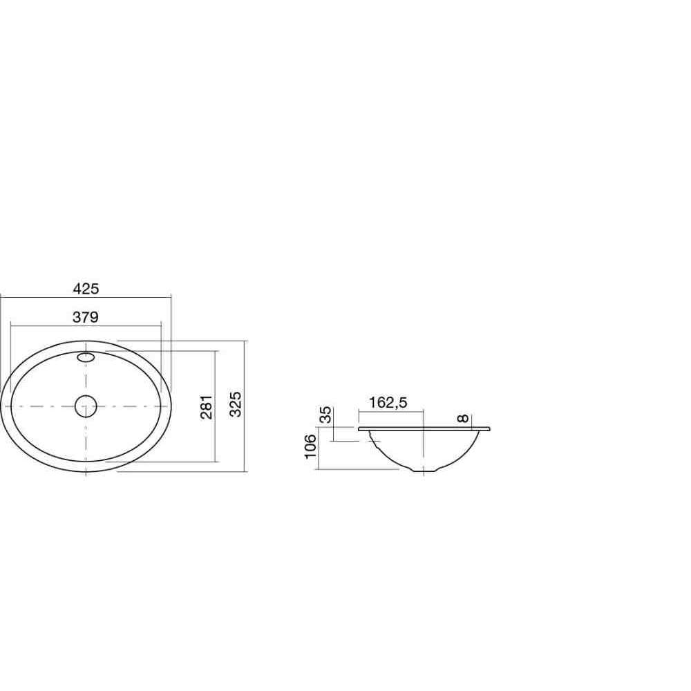 Umywalka podblatowa, owalna, forma 379 x 281mm, głębokość 106mm, przeszklona wewnątrz i na zewnątrz, bez otworu na baterię, z przelewem, w komplecie zestaw przelewowy