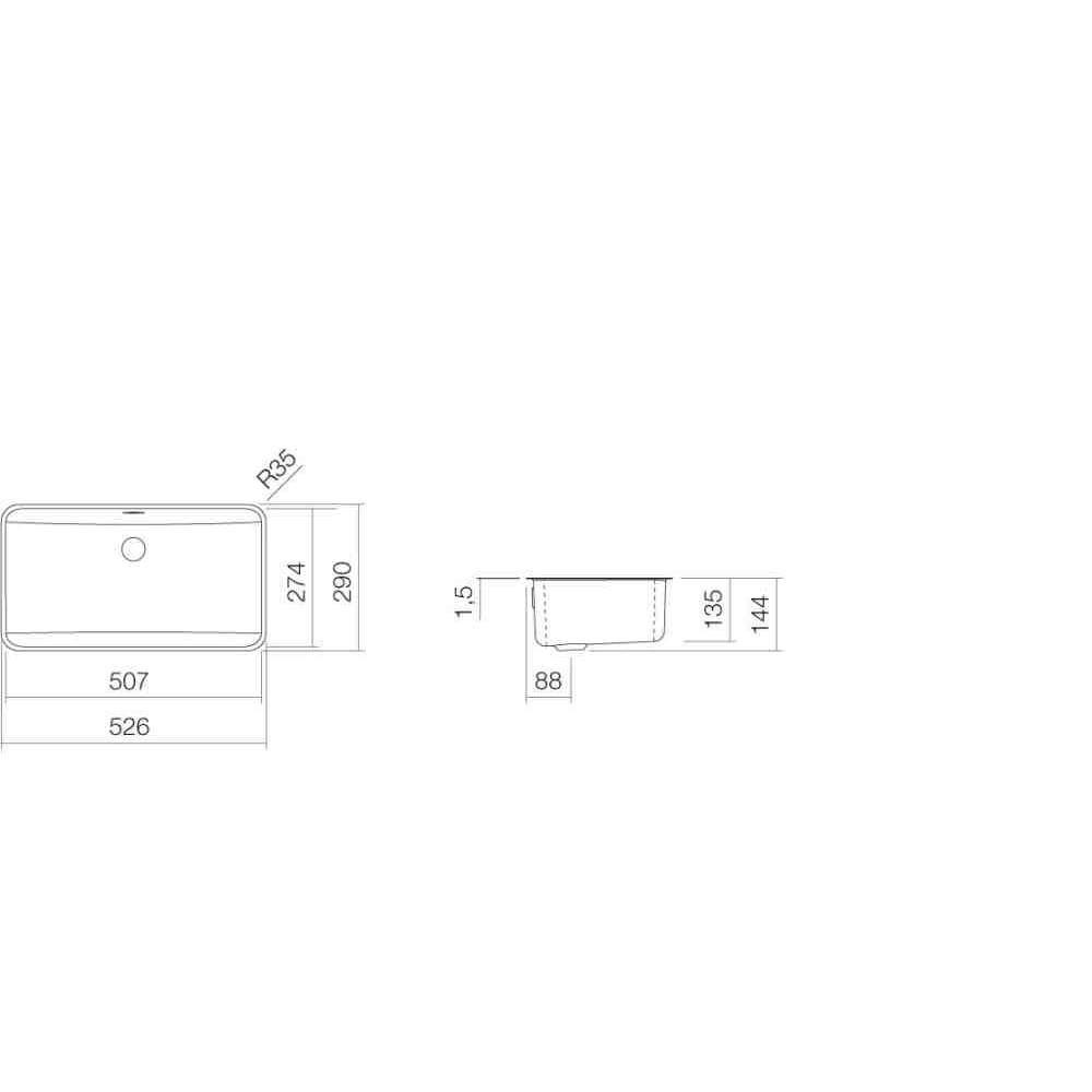 Umywalka podblatowa, prostokątna, forma 507 x 274mm, głębokość 135mm, przeszklona wewnątrz i na zewnątrz, bez otworu na baterię, z przelewem, w komplecie zestaw przelewowy