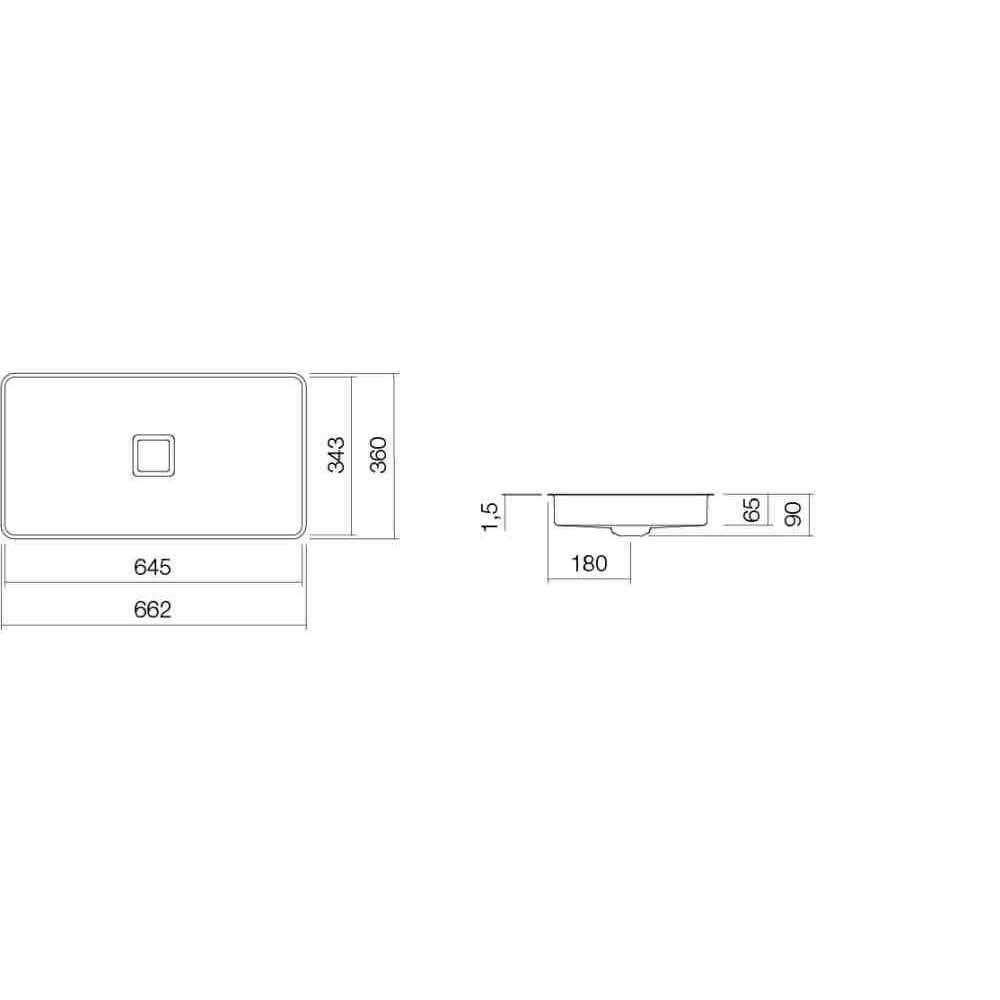 Umywalka podblatowa, prostokątna, forma 645 x 343 mm, głębokość 65 mm, przeszklona wewnątrz i na zewnątrz, bez otworu na baterię i przelewu, z zaworem odpływowym z białą przeszkloną pokrywą