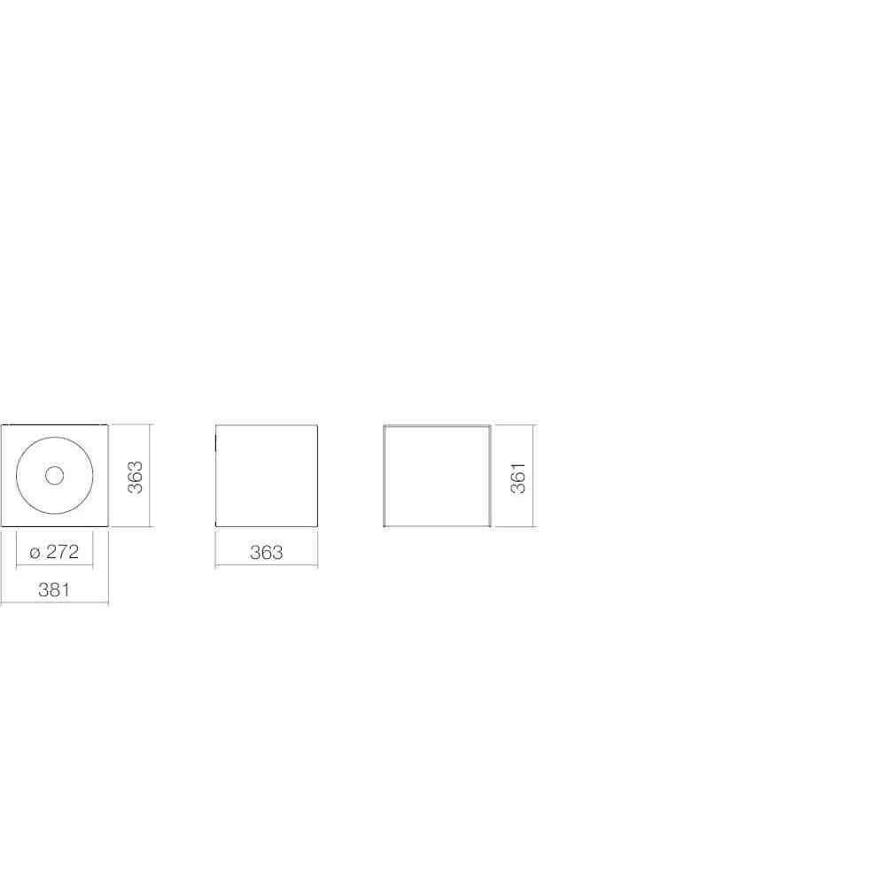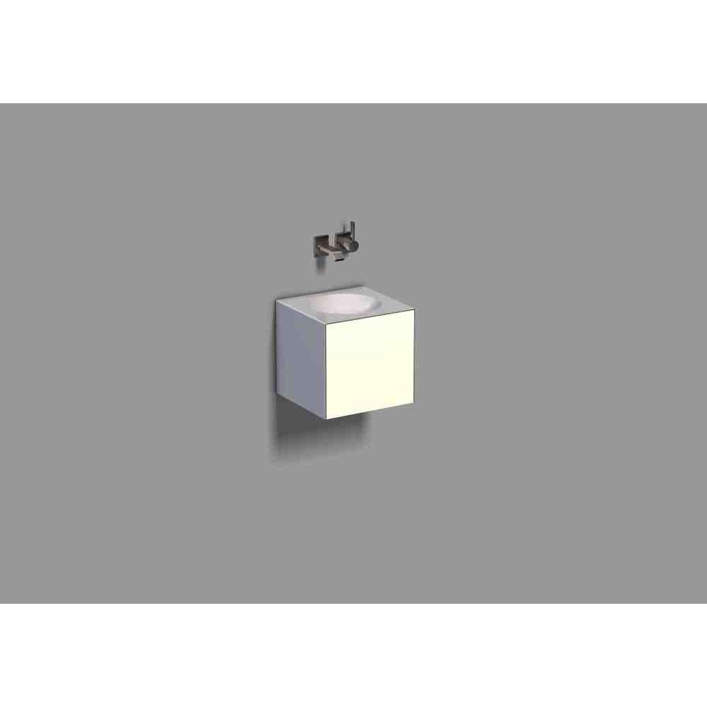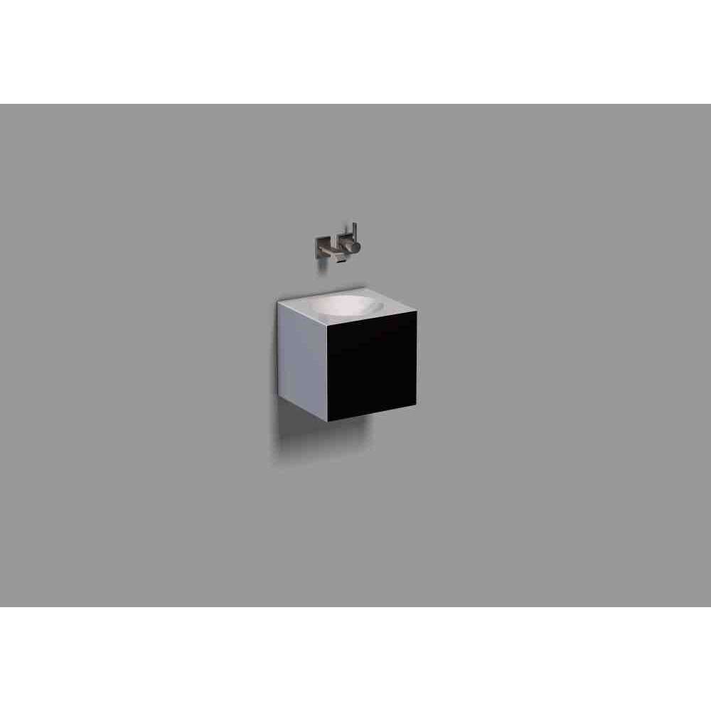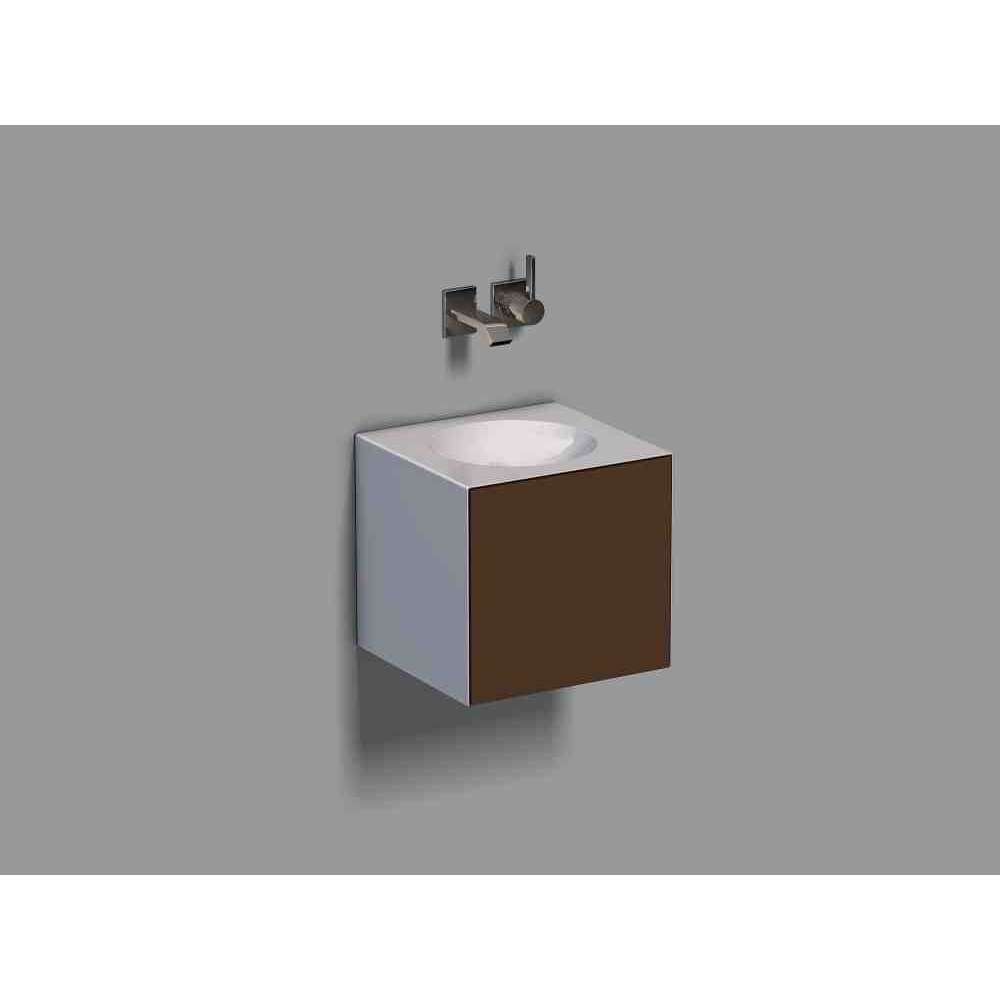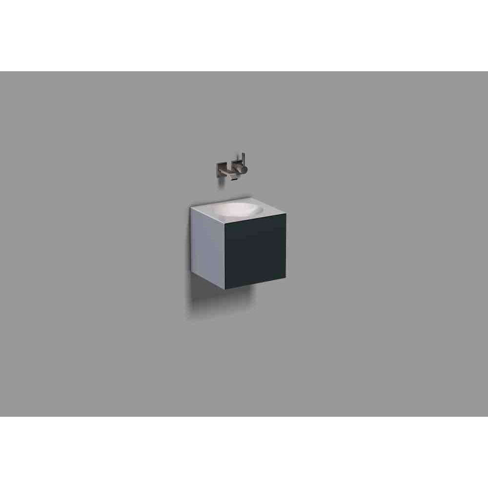 Umywalka, prostokątna, 381 x 363 mm, wysokość 361 mm, wyśrodkowana okrągła forma umywalkowa, bez otworu na baterię, bez przelewu, bocznie obwodowa pokrywa umywalki szkliwiona na biało, szafka podumywalkowa z ogranicznikiem drzwi po lewej stronie, bez uchwytów, otwierana przyciskiem , powierzchnia mebla wykończona jedwabistym matem, zawiera zawór szybowy z białą przeszkloną nasadką, syfon oszczędzający miejsce i zestaw mocujący.