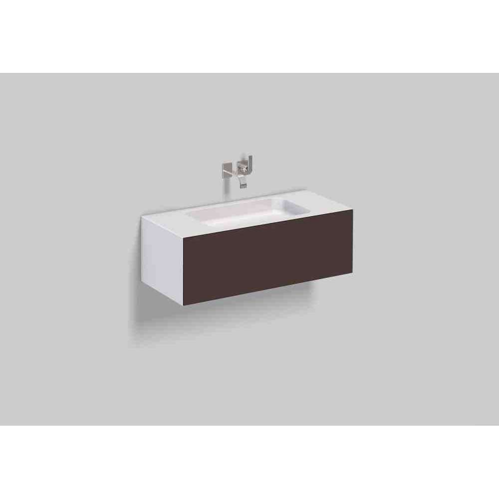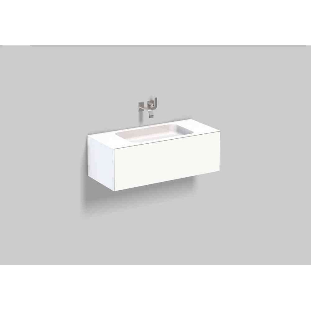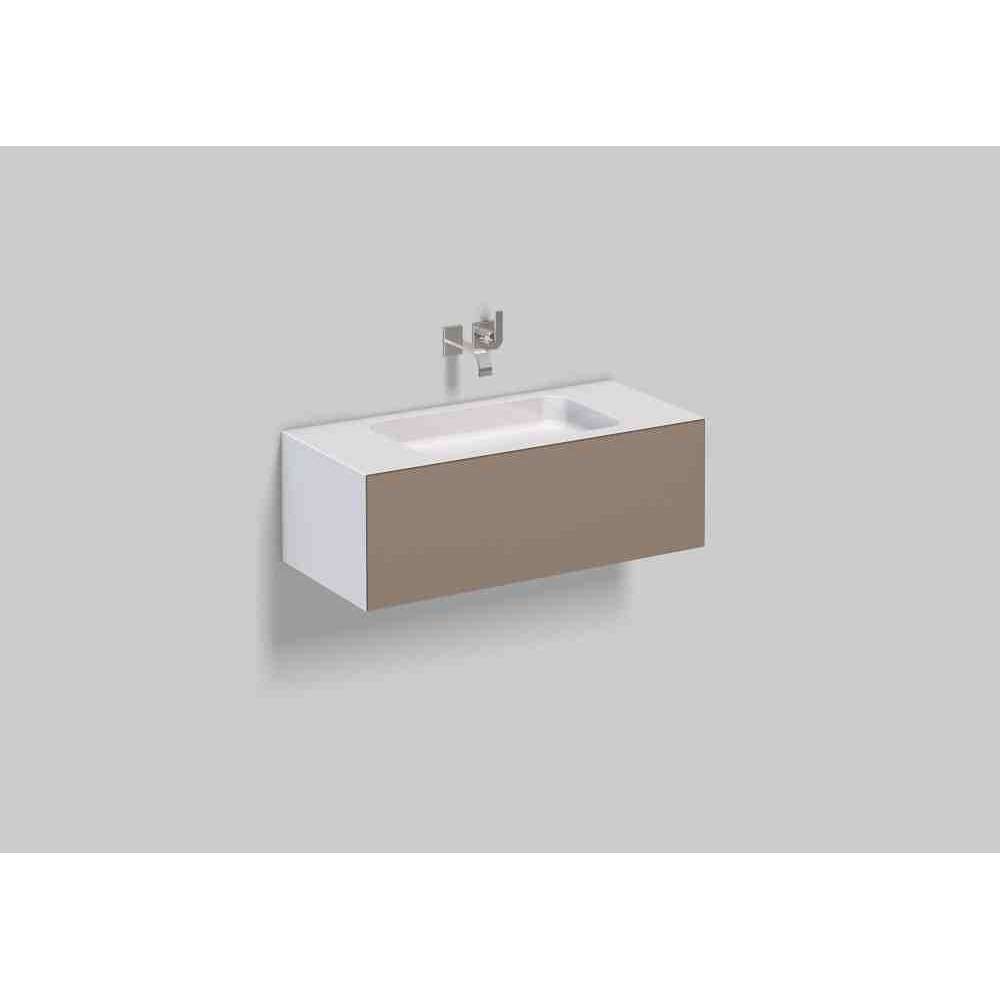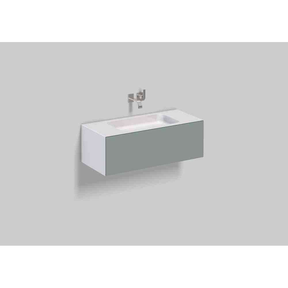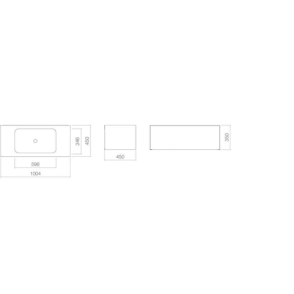 Umywalka, prostokątna, 1004 x 450 mm, wysokość 350 mm, prostokątna forma bez otworu na baterię, bez przelewu, po bokach biała glazurowana obudowa umywalki, bezuchwytowa szafka stojąca z push-to-open, pełna głębokość szuflady, powierzchnia mebla wykończona jedwabistym matem, z odpływem zawór z okrągłą, białą nakrętką, syfonem zajmującym mało miejsca i zestawem mocującym