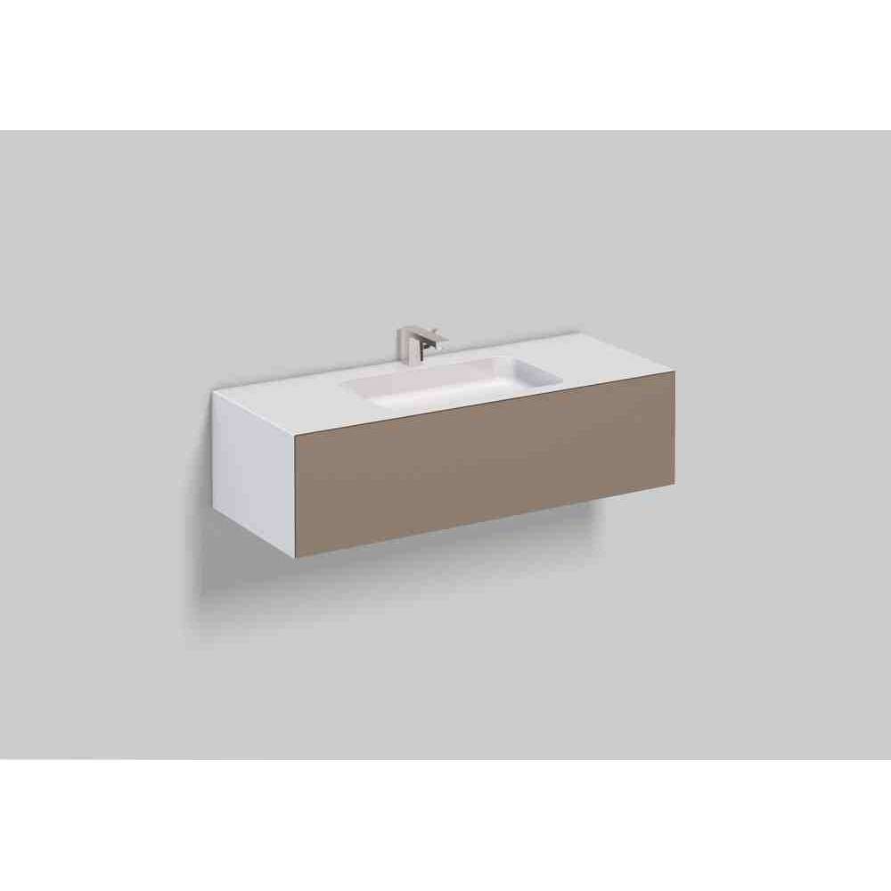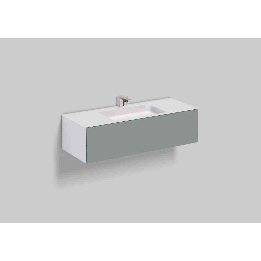 Umywalka prostokątna, 1254 x 500 mm, wysokość 350 mm, prostokątna forma z otworem na baterię, bez przelewu, po bokach biała glazurowana obudowa umywalki, bezuchwytowa szafka stojąca z push-to-open, szuflada o pełnej głębokości, powierzchnia mebla wykończona jedwabistym matem, z odpływem zawór z okrągłą, białą nakrętką, syfonem zajmującym mało miejsca i zestawem mocującym
