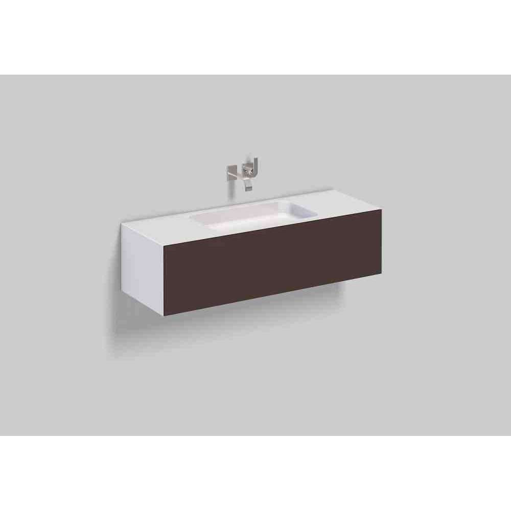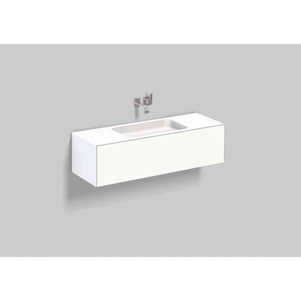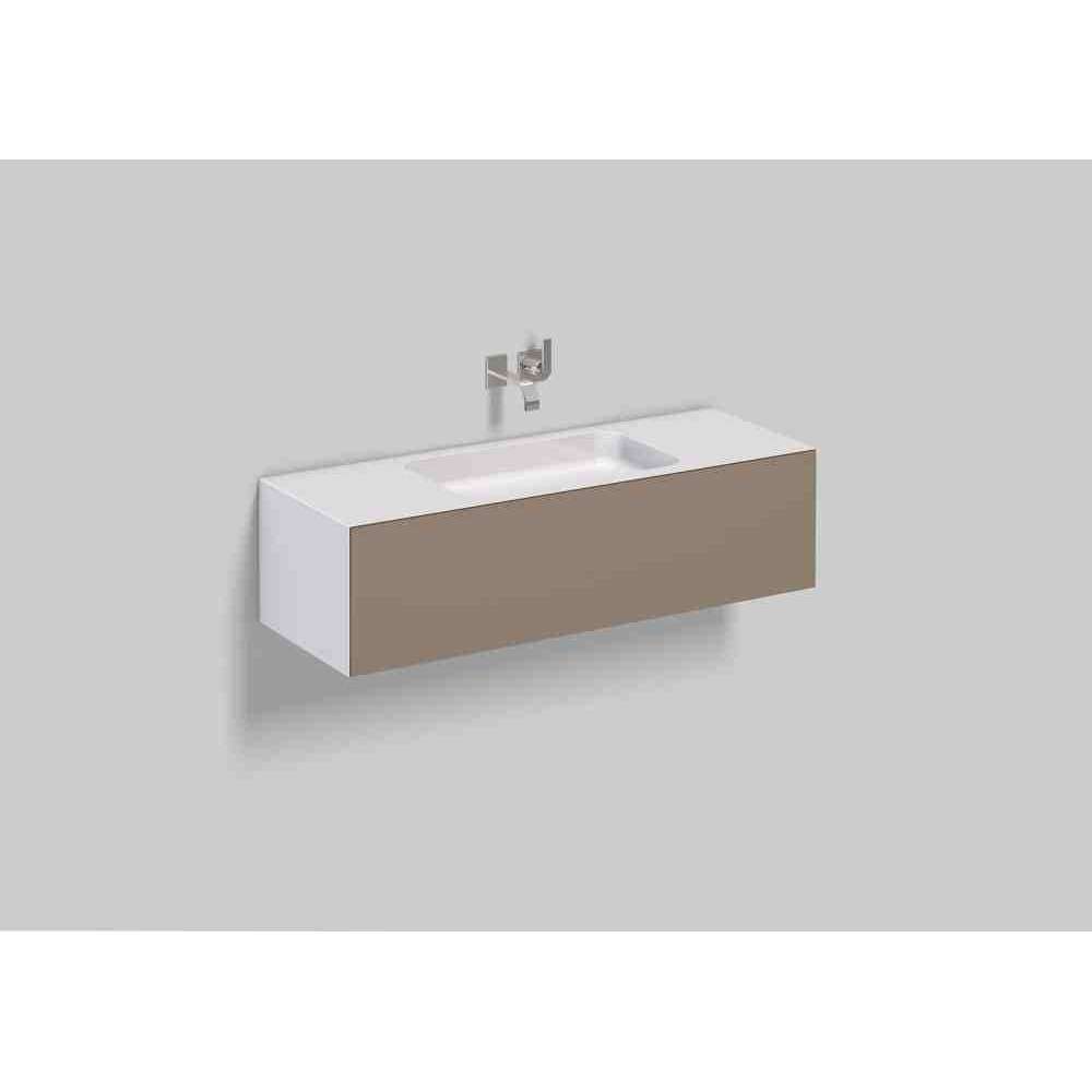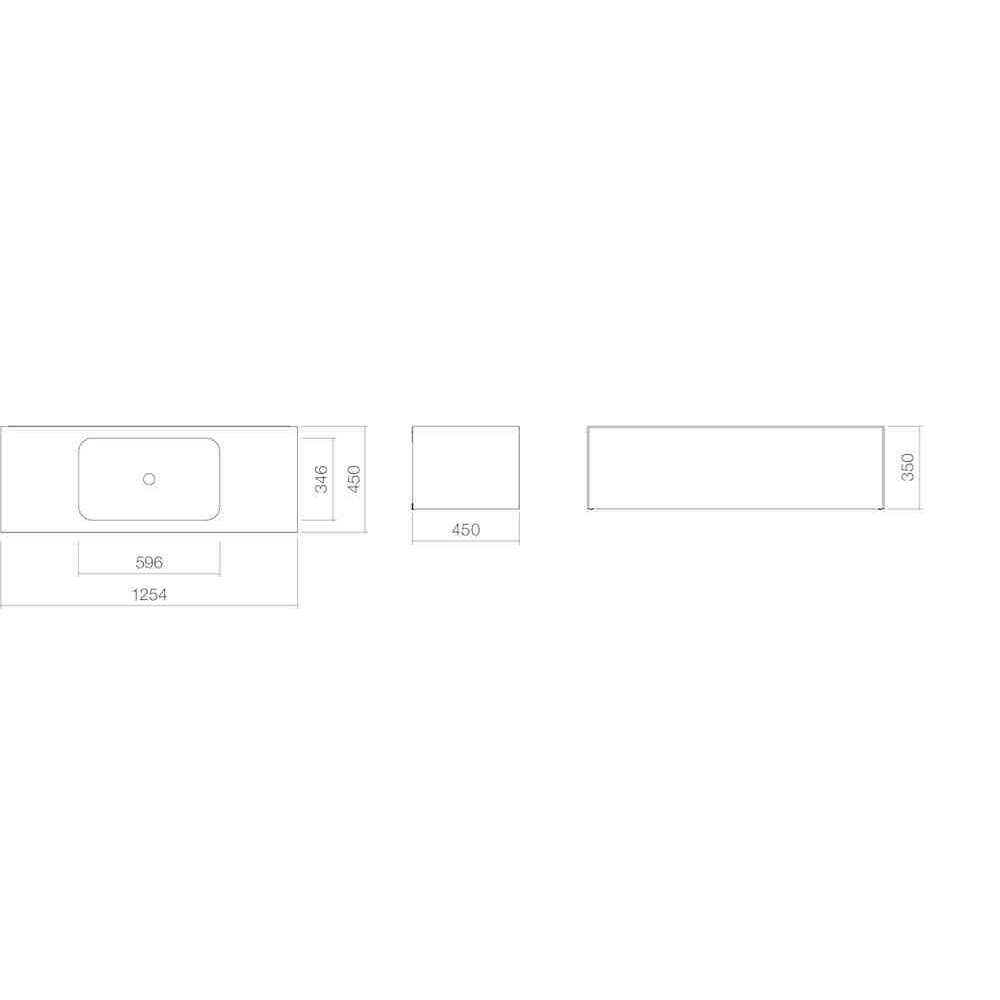 Umywalka, prostokątna, 1254 x 450 mm, wysokość 350 mm, prostokątna forma bez otworu na baterię, bez przelewu, po bokach biała glazurowana obudowa umywalki, bezuchwytowa szafka stojąca z push-to-open, pełna głębokość szuflady, powierzchnia mebla wykończona jedwabistym matem, z odpływem zawór z okrągłą, białą nakrętką, syfonem zajmującym mało miejsca i zestawem mocującym