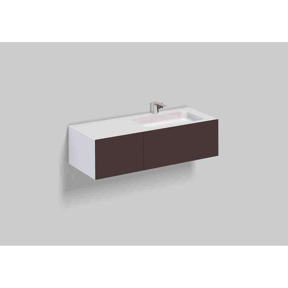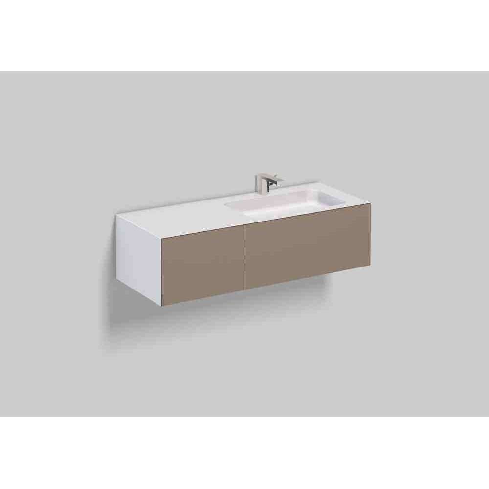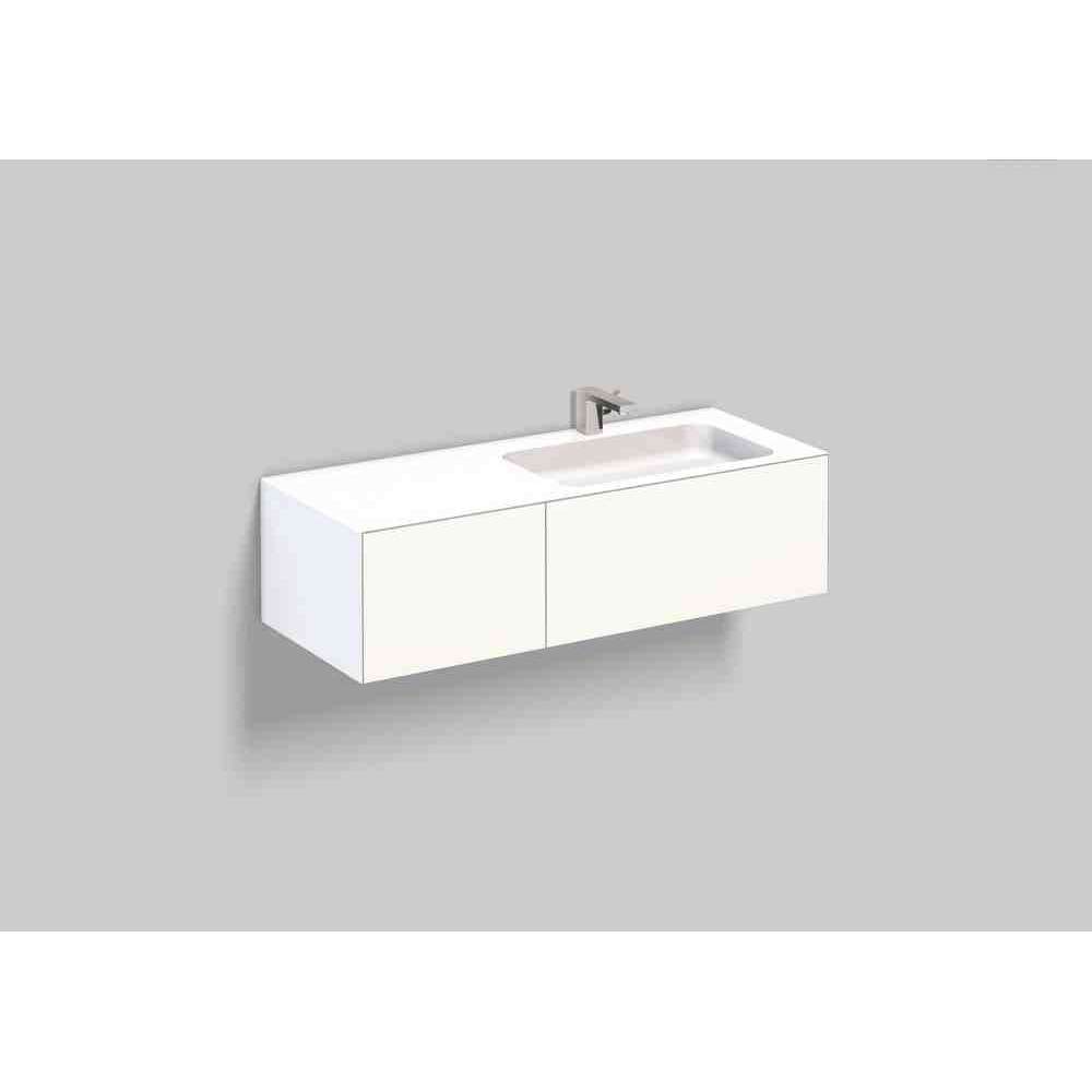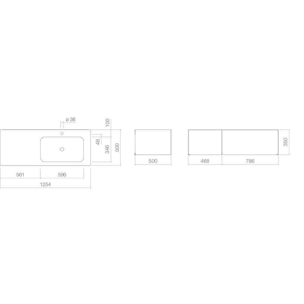 Umywalka, prostokątna, 1254 × 500 mm, wysokość 350 mm, prostokątna forma po prawej stronie, z otworem na baterię, bez przelewu, boczna, przeszklona biała obudowa umywalki, szafka bezuchwytowa z przyciskiem otwierania, dwie szuflady o pełnej głębokości, wykończenie jedwabiście matowe powierzchnia meblowa, w tym zawór odpływowy z okrągłą, białą nasadką szklaną, syfon zajmujący mało miejsca i zestaw mocujący