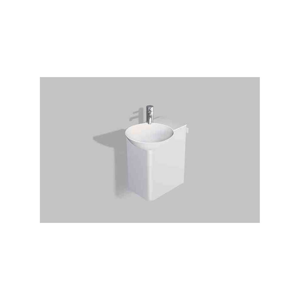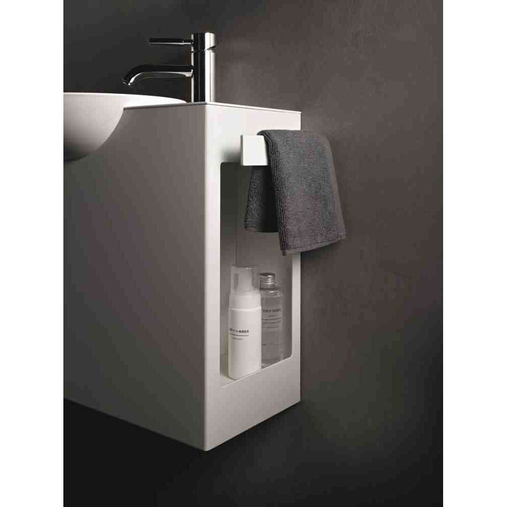 Umywalka, 485 x 317 mm, wysokość 470 mm, umywalka 300 mm ze stali przeszklonej na biało, lewa, bez przelewu, szafka dolna malowana proszkowo na biało, z otworem na baterię, półka biała ze stali przeszklonej, szafka z półkami i uchwytem na ręczniki po prawej, zawiera chromowany odpływ zawór i zestaw mocujący