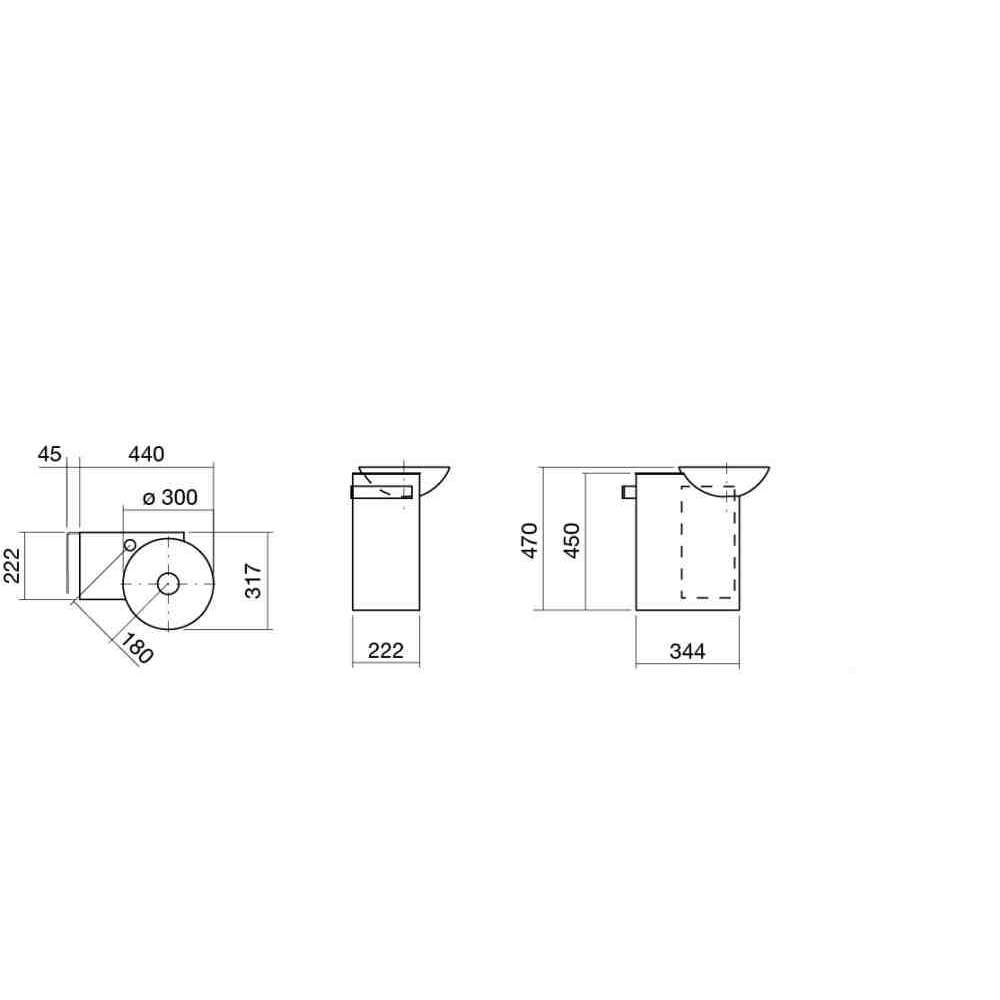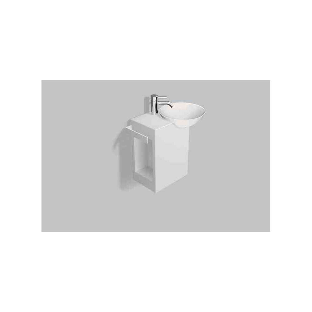 Umywalka, 485 x 317 mm, wysokość 470 mm, umywalka 300 mm ze stali przeszklonej na biało, prawa, bez przelewu, szafka dolna malowana proszkowo na biało, z otworem na baterię, półka biała ze stali przeszklonej, szafka z półkami i uchwytem na ręczniki po lewej, zawiera chromowany odpływ zawór i zestaw mocujący
