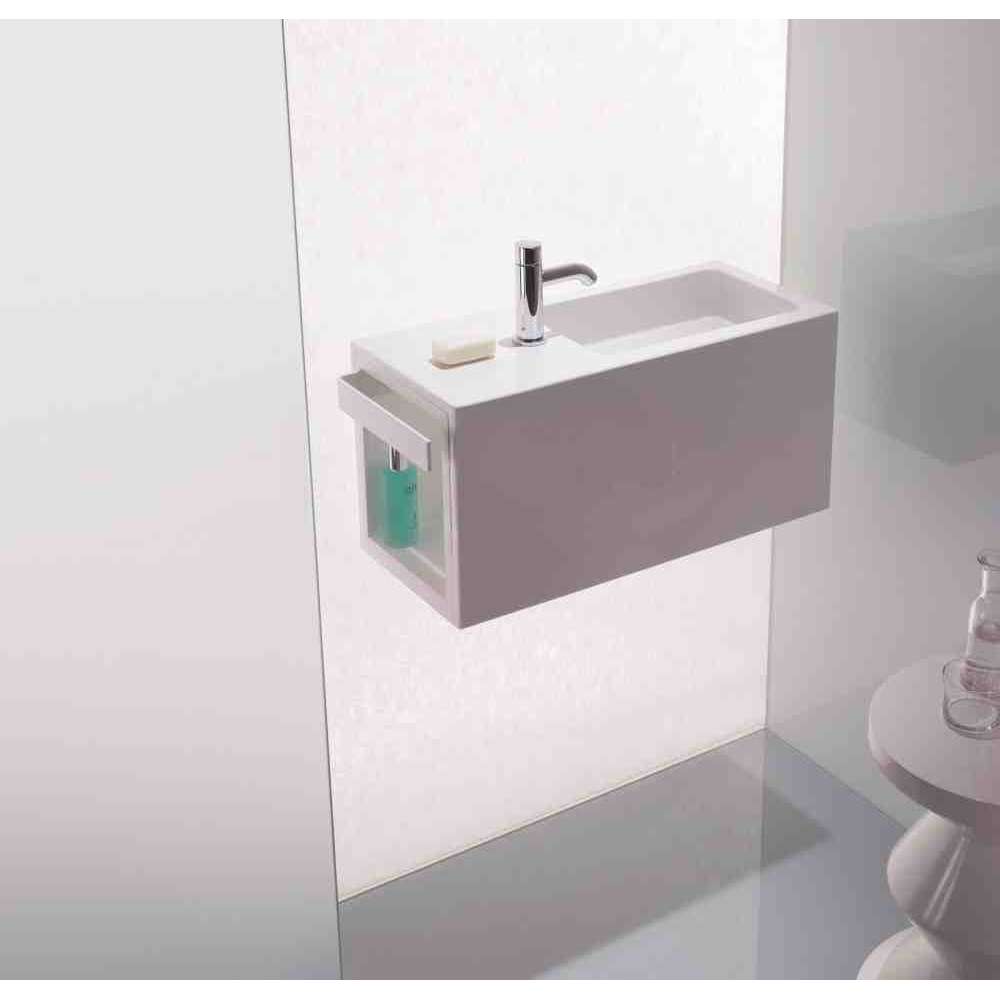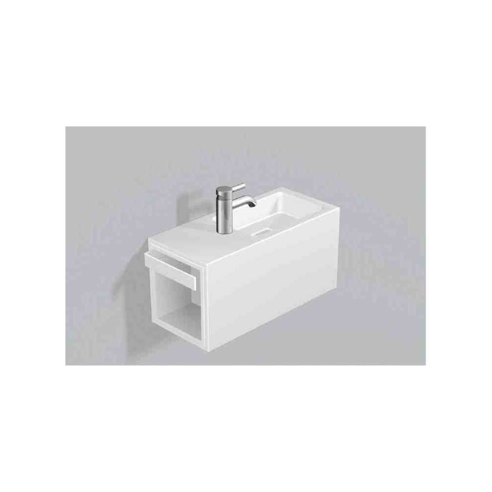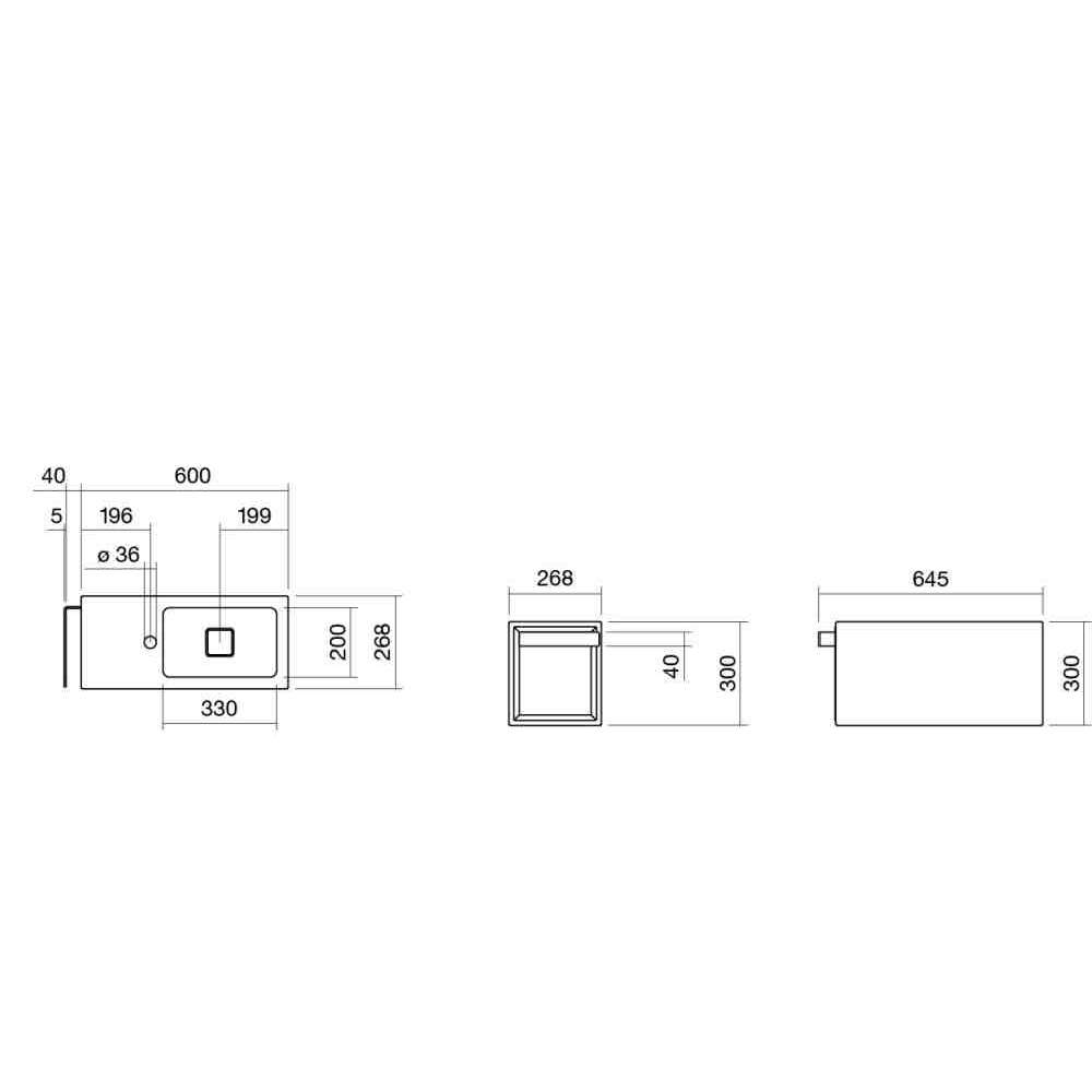 Umywalka, prostokątna, 645 x 268 mm, wysokość 300 mm, prostokątna forma umywalkowa po prawej stronie, przeszklona wewnątrz i na zewnątrz, półka do przechowywania i wieszak na ręczniki po lewej, z otworem na baterię, bez przelewu, zawiera zestaw mocujący i przeszklony zawór odpływowy w kolorze białym