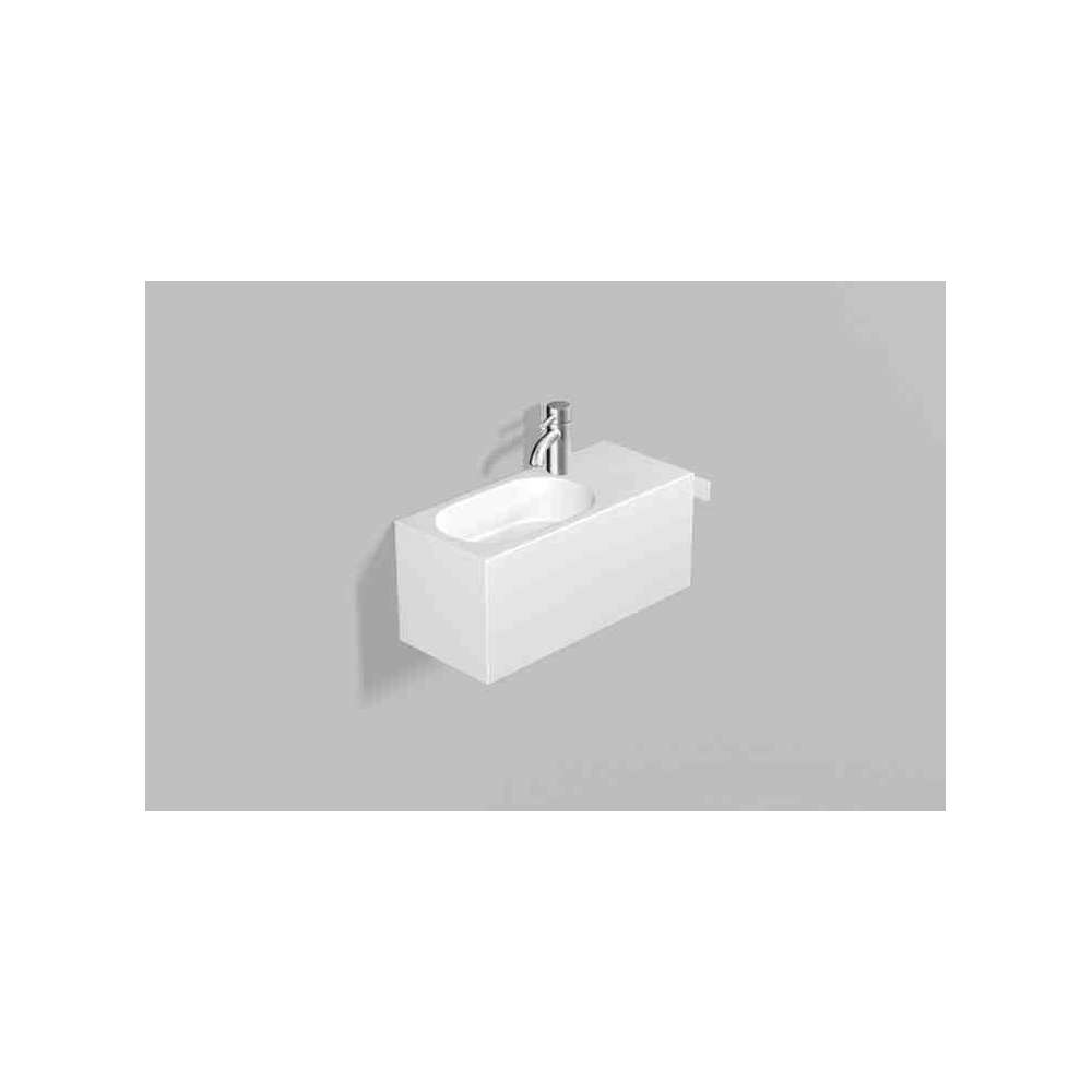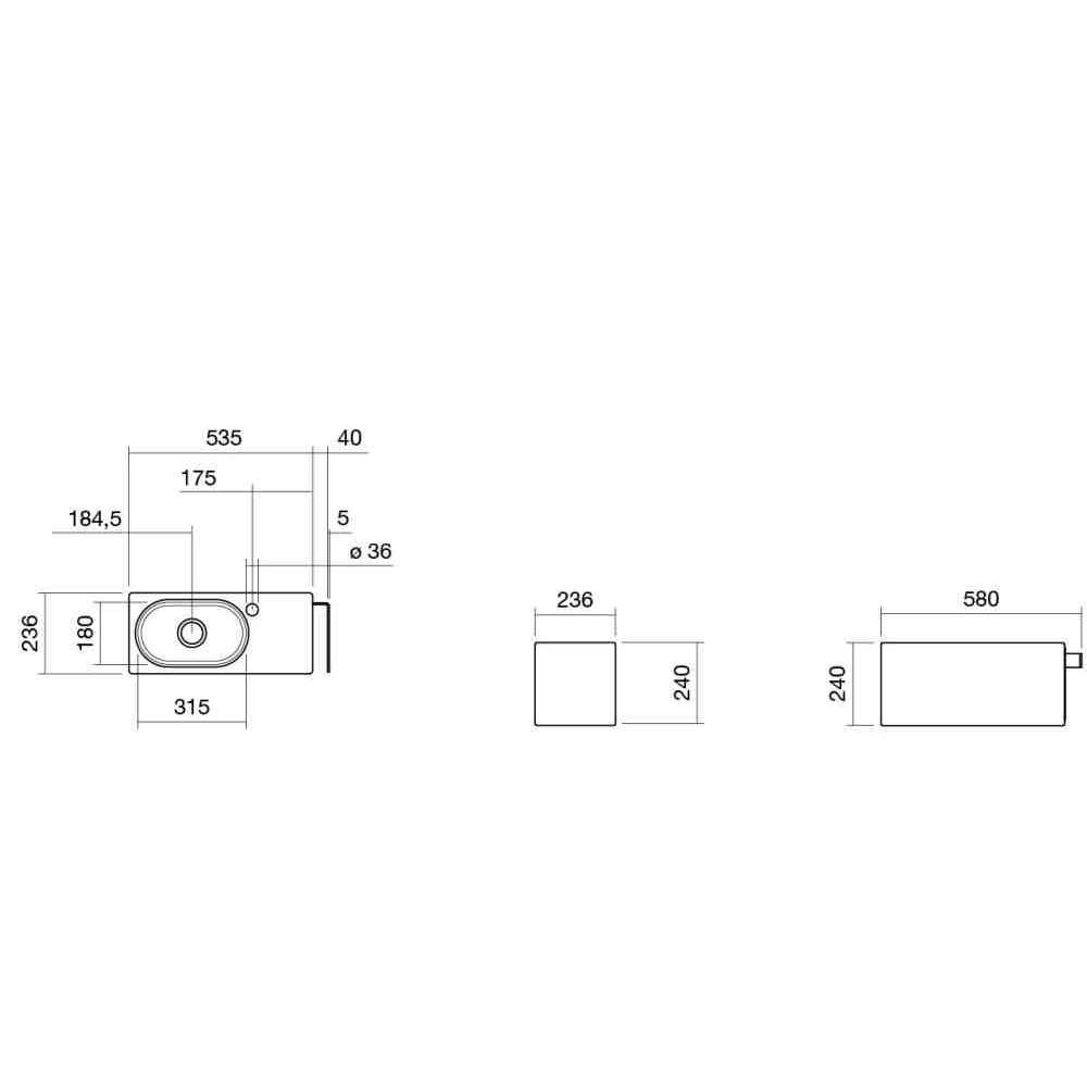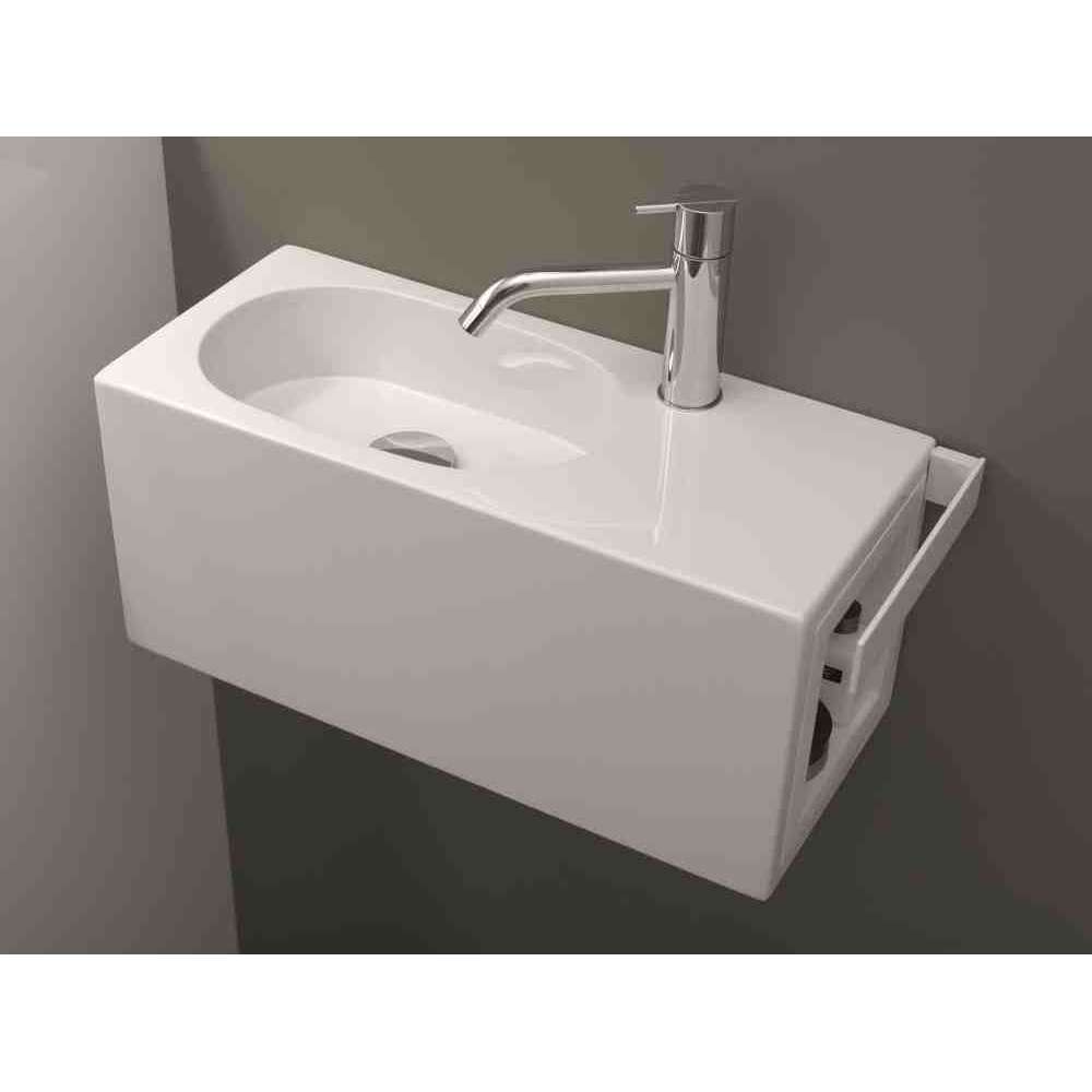 Umywalka prostokątna, 580 x 236 mm, wysokość 240 mm, po lewej owalna forma umywalkowa, przeszklona wewnątrz i na zewnątrz, po prawej półka do przechowywania i wieszak na ręczniki, z otworem na baterię, bez przelewu, z zestawem mocującym i chromowanym zaworem odpływowym