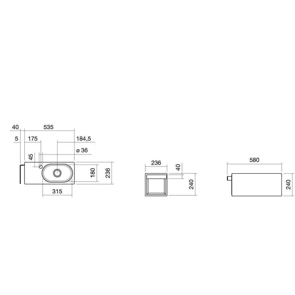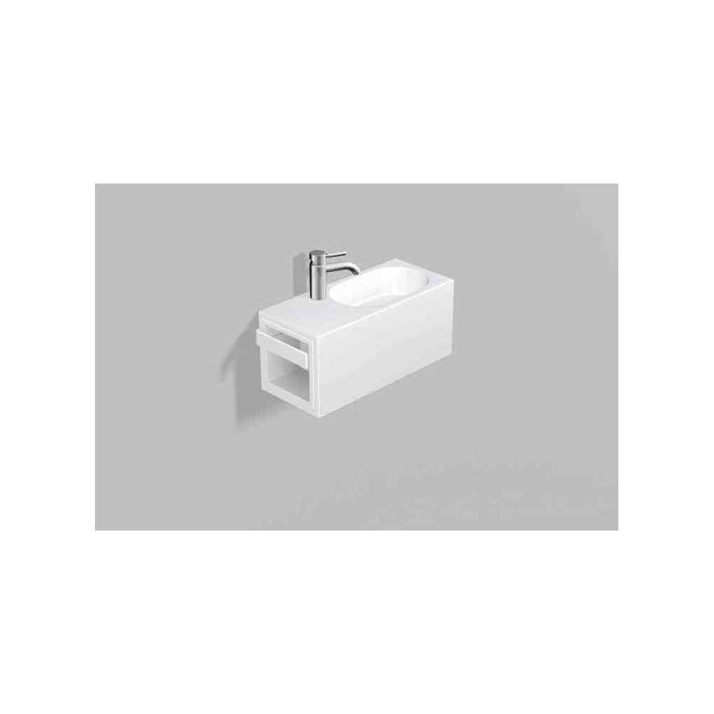 Umywalka prostokątna, 580 x 236 mm, wysokość 240 mm, po prawej owalna forma umywalkowa, przeszklona wewnątrz i na zewnątrz, po lewej półka do przechowywania i wieszak na ręczniki, z otworem na baterię, bez przelewu, z zestawem mocującym i chromowanym zaworem odpływowym