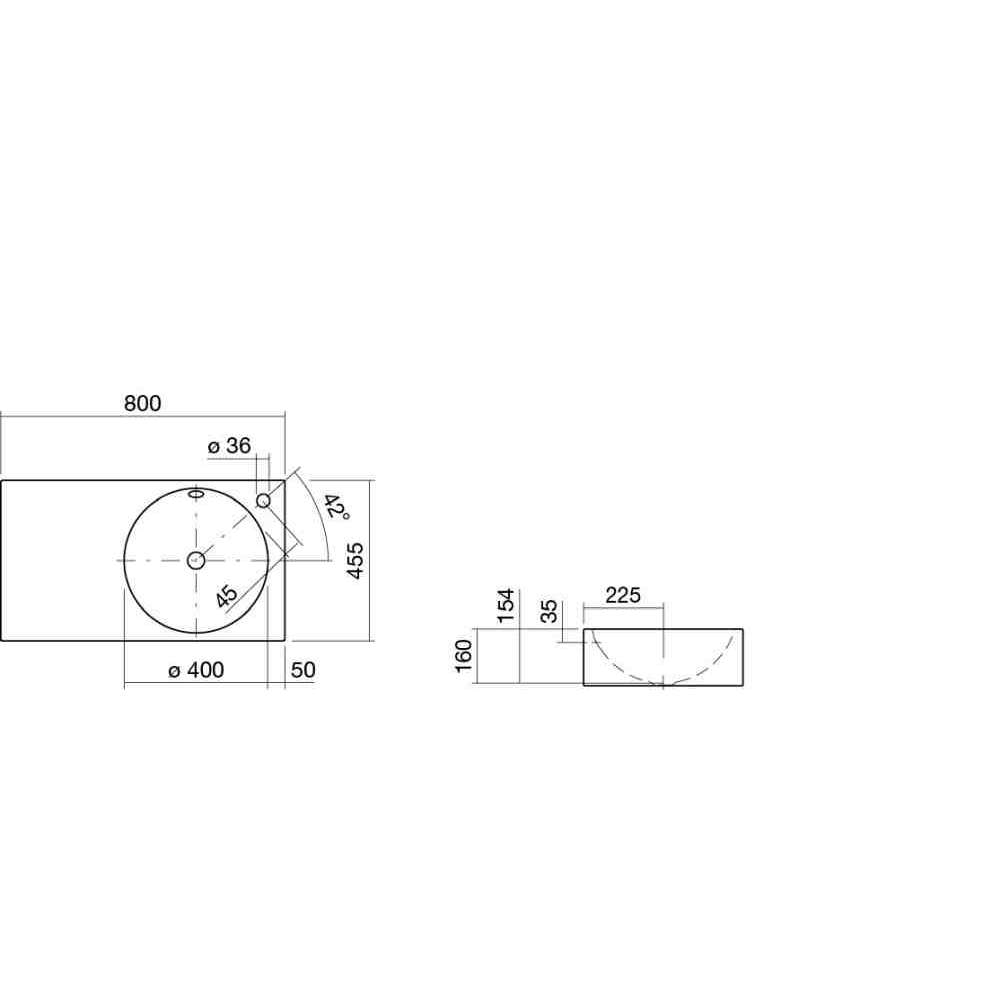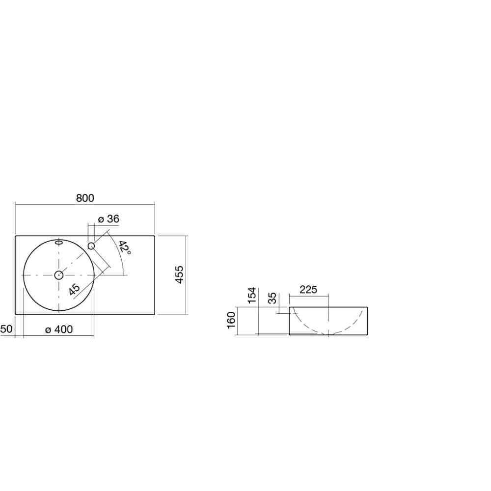 Szafka pod umywalkę, prostokątna, 800 x 455 mm, okrągła forma umywalkowa z lewej/prawej strony, przeszklona wewnątrz i na zewnątrz, wysokość 160 mm, z otworem na baterię i przelewem, zawiera zestaw montażowy i zestaw przelewowy
