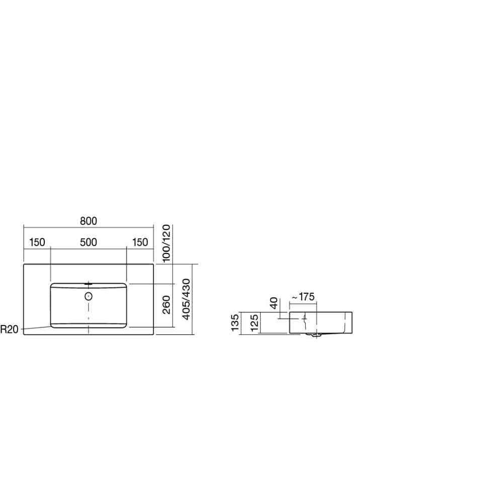 Umywalka prostokątna, 800 x 405mm, prostokątna forma umywalkowa wyśrodkowana, przeszklona wewnątrz i na zewnątrz, wysokość 125mm, bez otworu na baterię, z przelewem, w komplecie zestaw montażowy i zestaw przelewowy