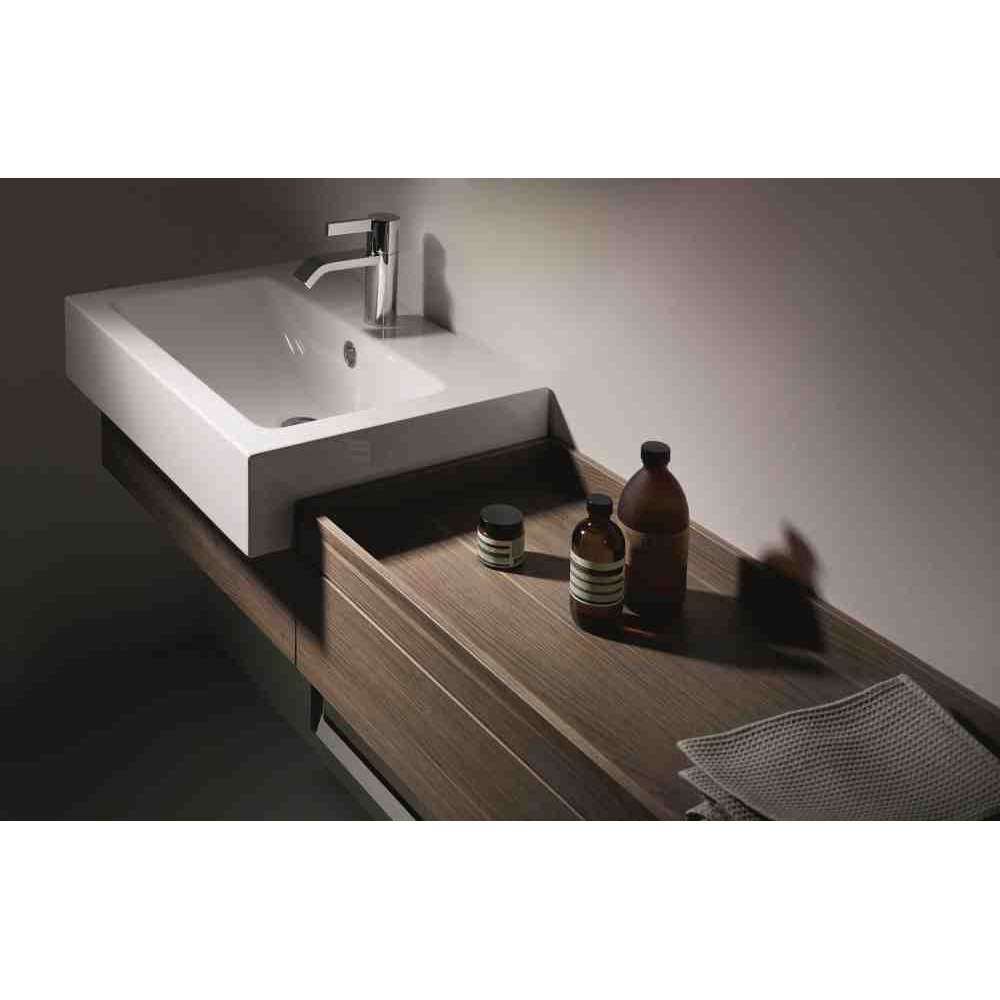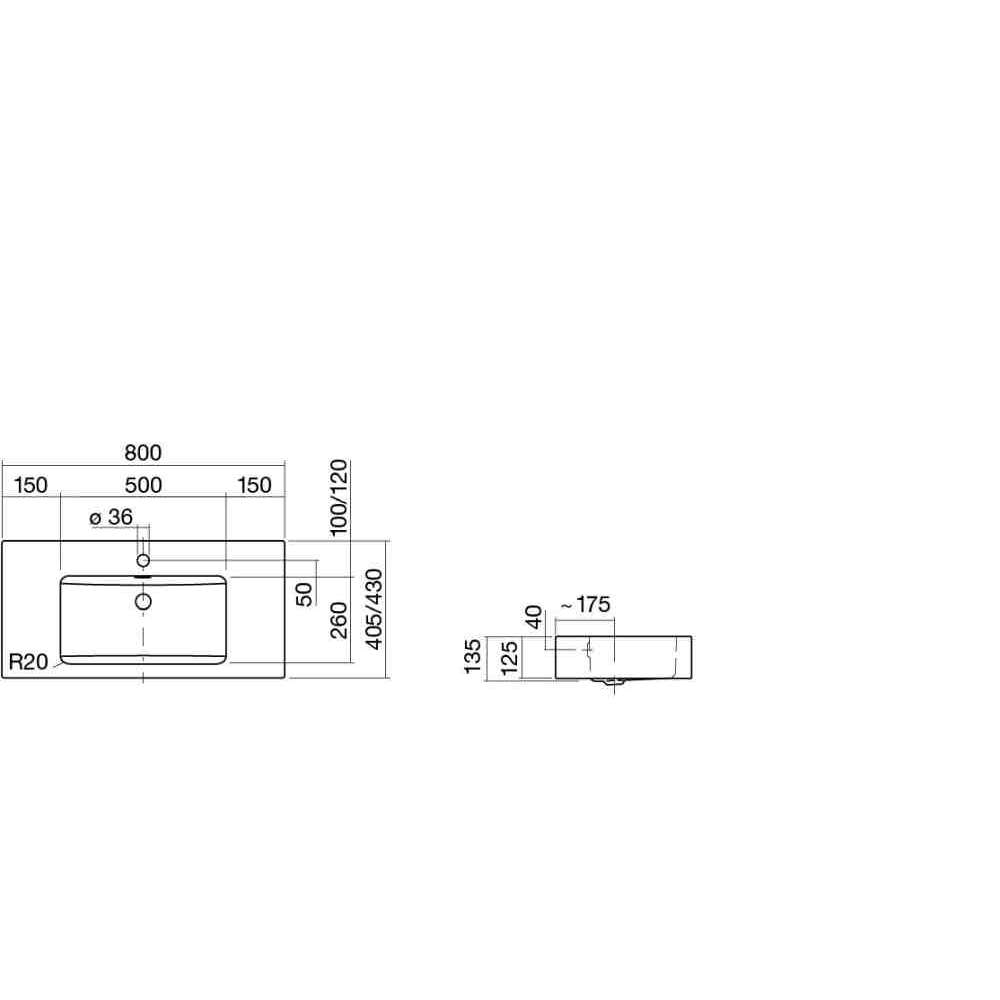 Umywalka prostokątna, 800 x 405 mm, prostokątna forma do umywalki wyśrodkowana, przeszklona wewnątrz i na zewnątrz, wysokość 125 mm, z otworem na baterię i przelewem, zawiera zestaw montażowy i zestaw przelewowy