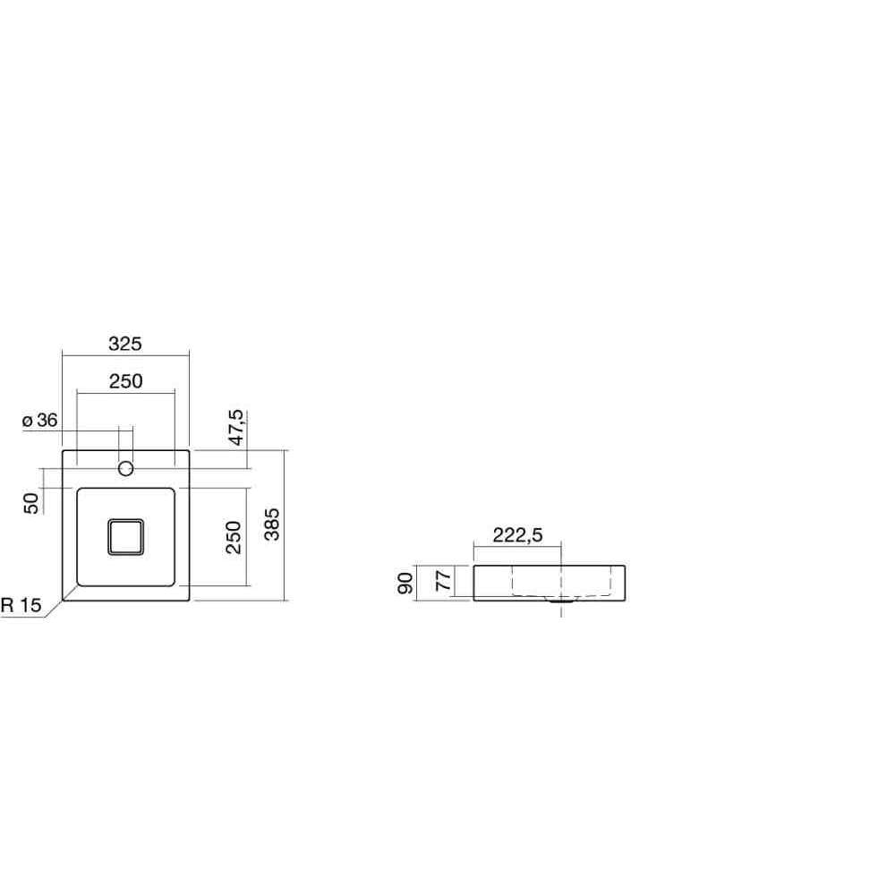 Szafka pod umywalkę, prostokątna, 325 x 385 mm, forma umywalkowa kwadratowa i centralna, przeszklona wewnątrz i na zewnątrz, wysokość 90 mm, z otworem na baterię, bez przelewu, z zestawem mocującym i zaworem spustowym z białą przeszkloną pokrywą